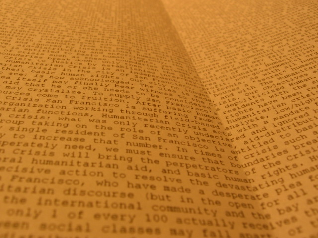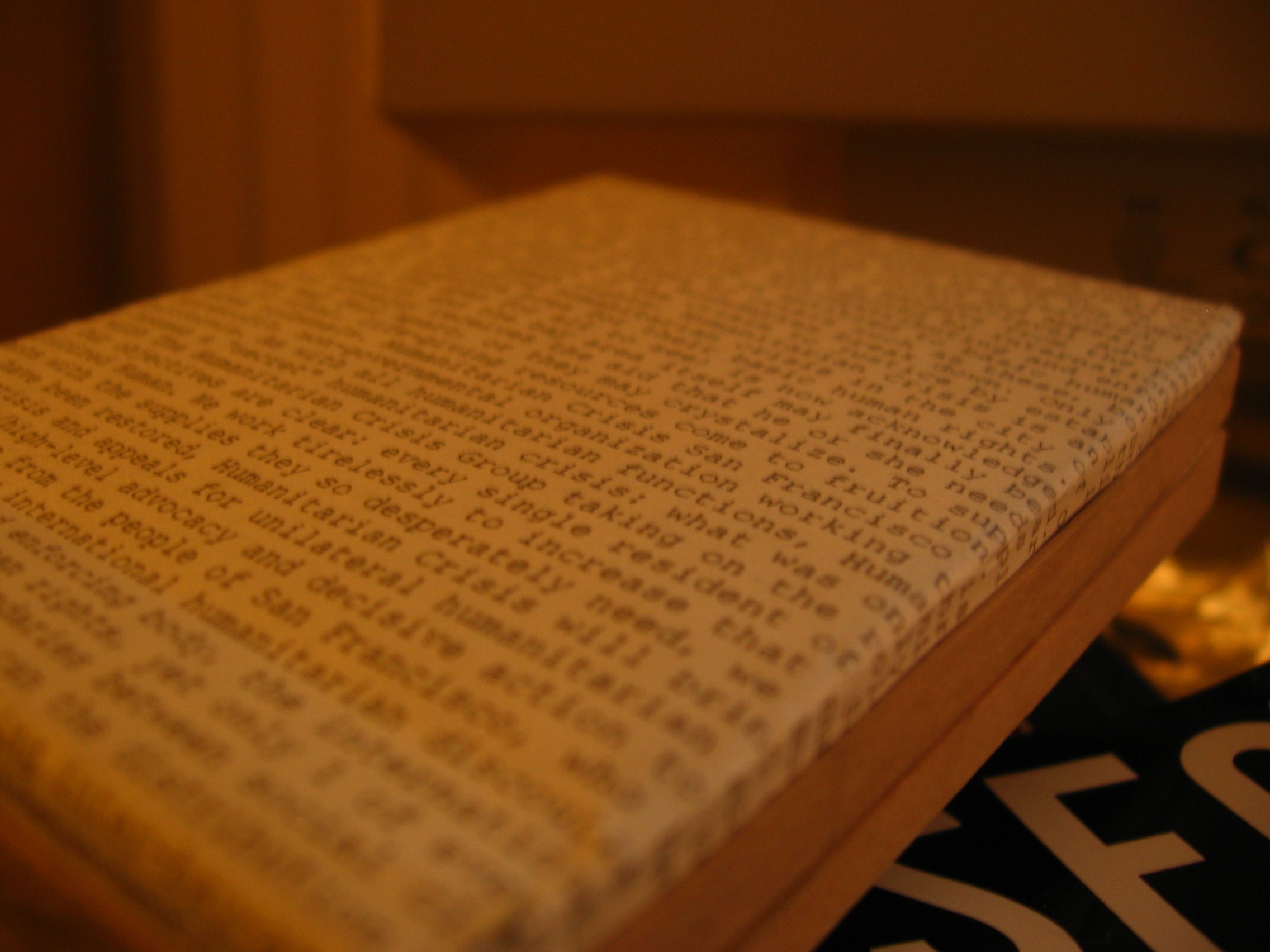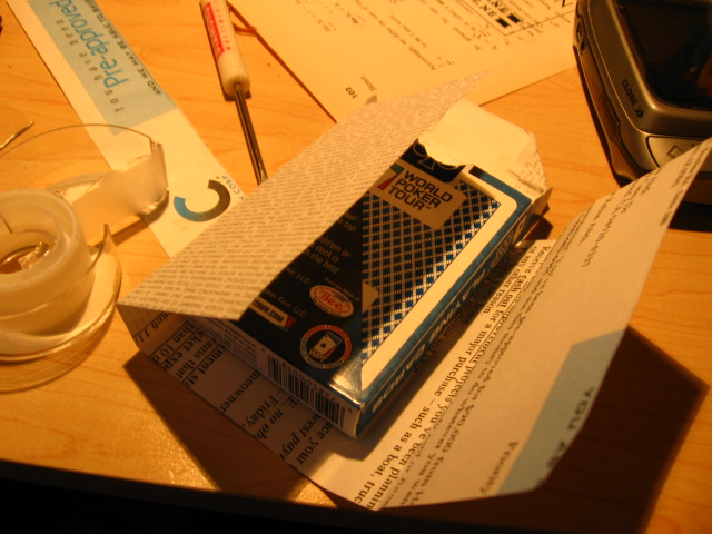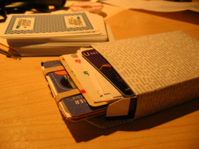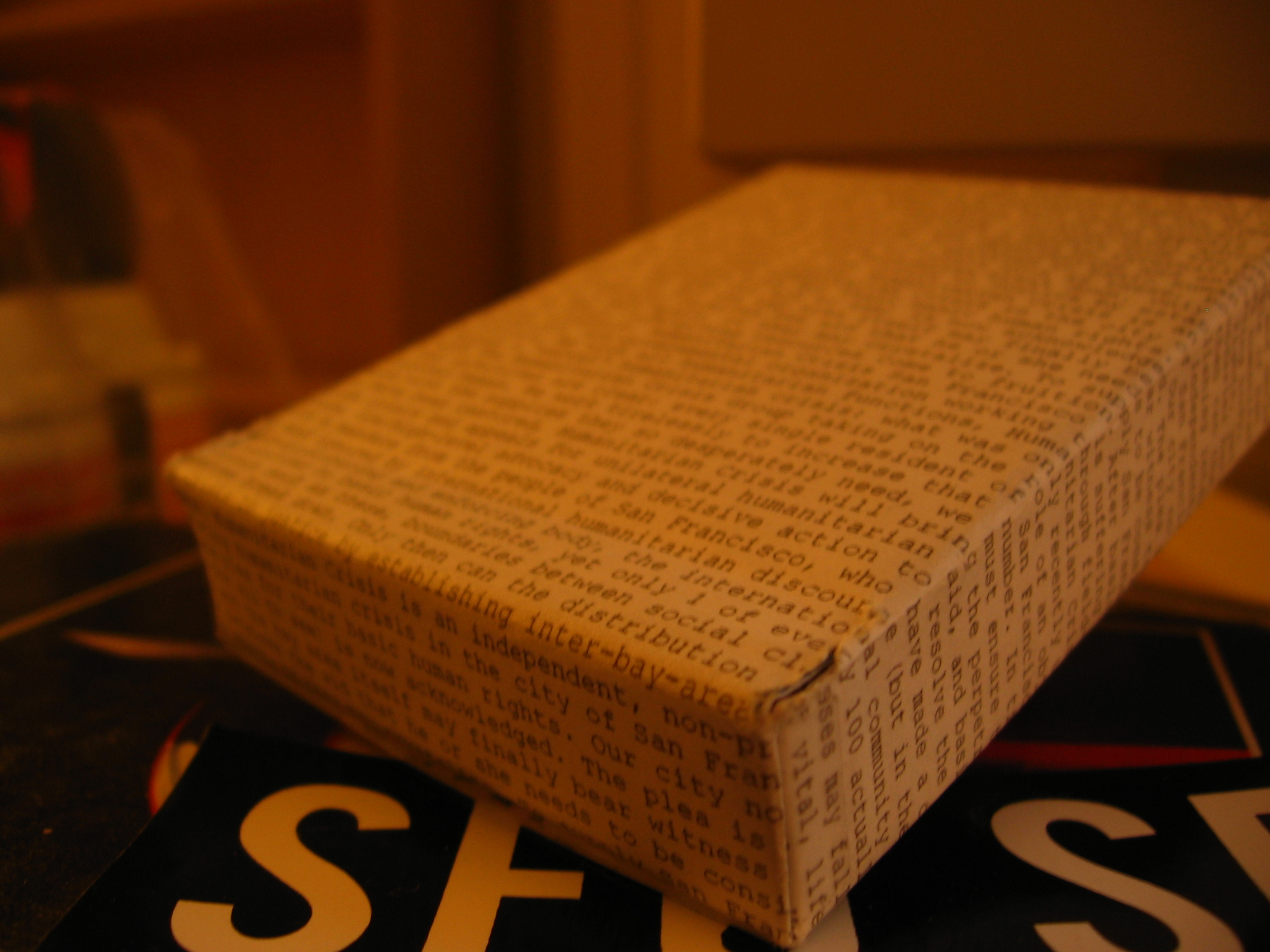 The playing card box held up really really well, to the point where I kept using it for the rest of the week. Eight people asked what's up with that? during the time, to which I'd try my best at defining SF0, Humanitarian Crisis, and the current task the antiwallet was a part of. Five of the times I was cut off mid way through the SF0 part with a demand for payment. This also gave me a great chance to rid my self of waller clutter. The down side to this was that I printed the text so small, most people gave up trying to read it. If there are times where I need to pack sort of light, chances are I'll be pulling the words of HC out again to hold my self together.