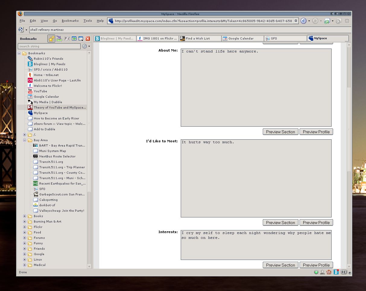 A friend of mine is about to get out of the army. After having a long discussion with his parents about thoughts on in subject of online communication, we all came to the conclusion that maybe it's not all fucked up. MySpace is his main form of networking with friends that are far away. Without it he'd be lost. So maybe it's not all bad?