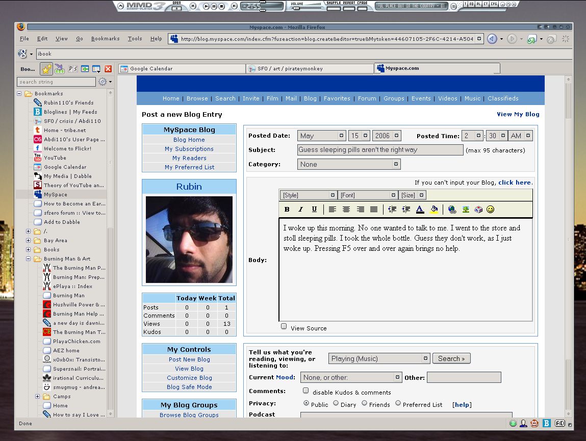 I started to prepare my account mid May. I posted a few journal entries on MySpace stating fake failed attempts at choking my self with cotton balls, and asking if anyone wants my stuff as pretty soon I wont be needing anything worldly anymore. These are things that are totally out of character for me, especially the fact that I wouldn't be doing it all through MySpace, a service I've vocally dissed within.