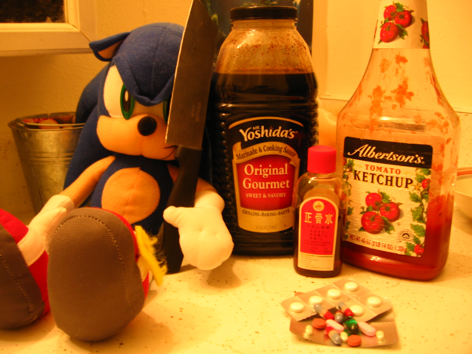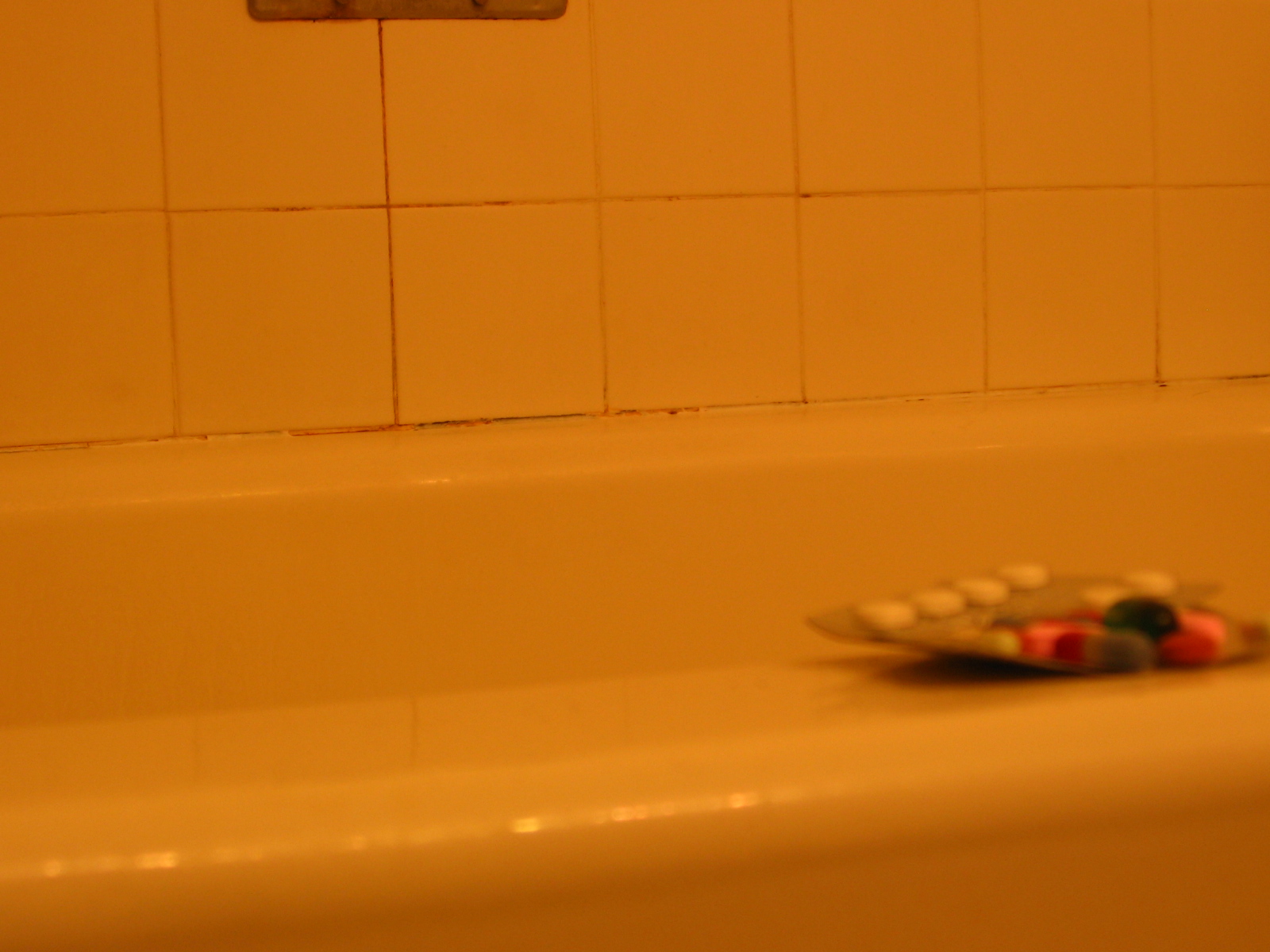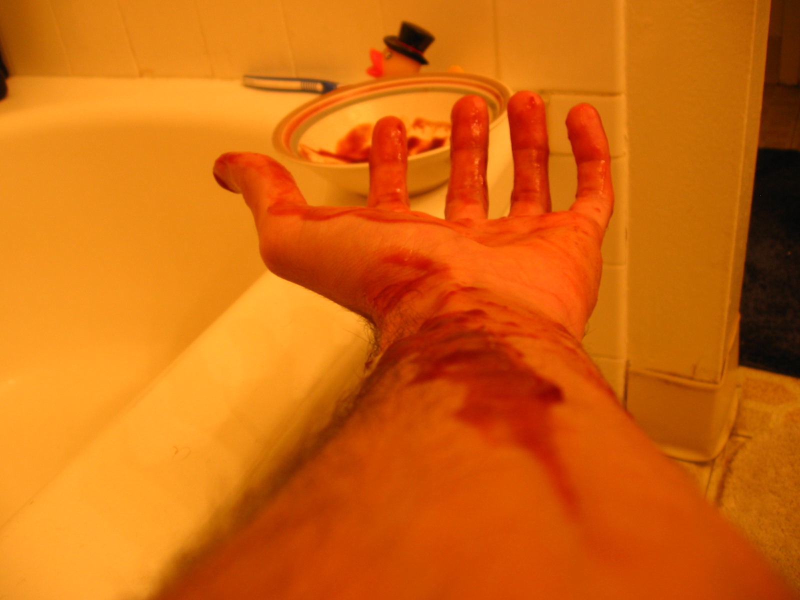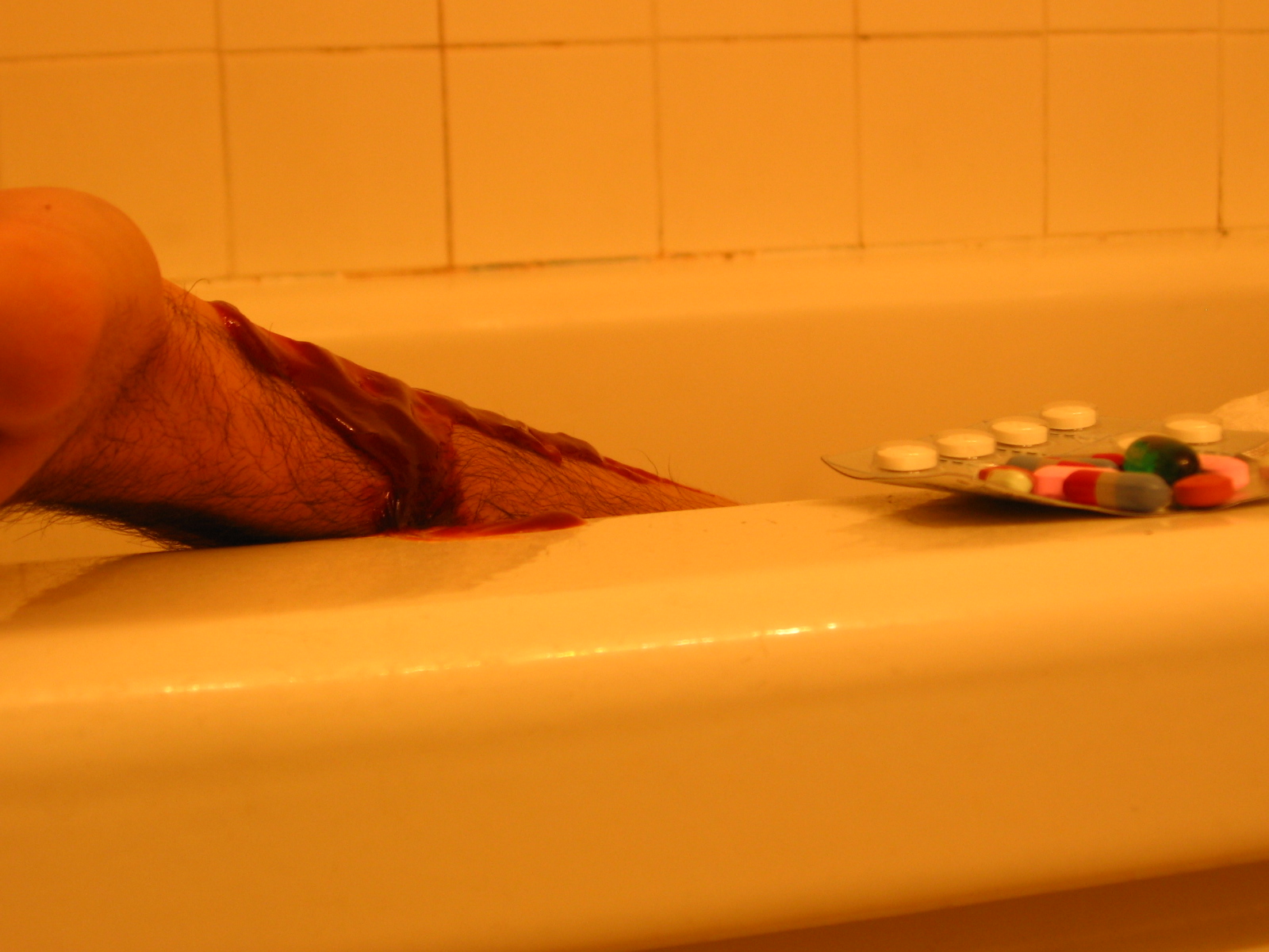 I mixed some soy goop with ketchup and water, made for some ok looking blood. I grabbed a large knife from the kitchen, and a bunch of random pills (peptobismal, aspirin, some diarrhea meds laying around from a past roommate). I took all this into the bathroom, sat in the tub, and proceeded to take pictures of me cutting my arm with the fake blood everywhere and the pills sitting on the side of the tub. If you can't figure it by now, I wanted to make it look like I was ODing on some pills while poorly/wrongly cutting my arms, and spewing loads of bad looking fake blood, with the final goal of faking my own suicide. I was making the photos to be later posted on my account.