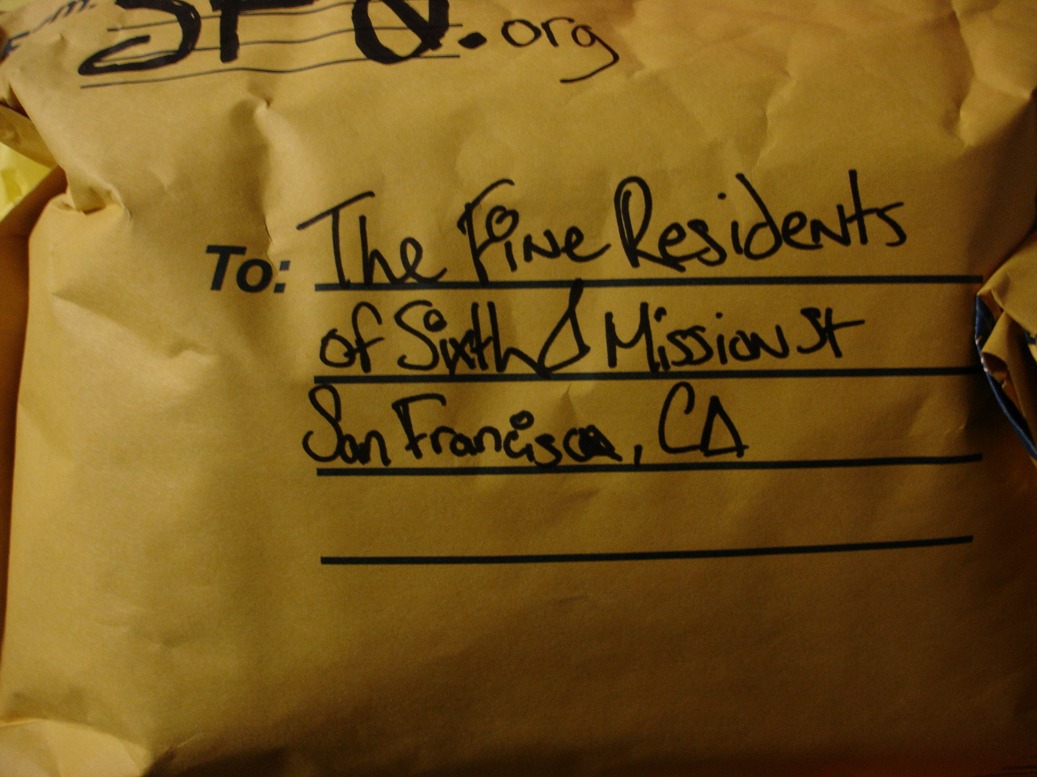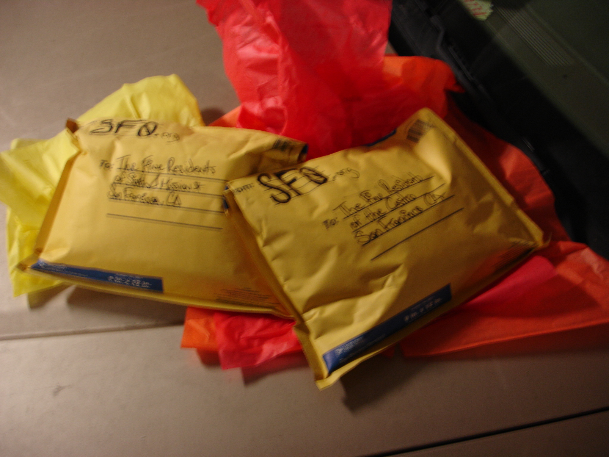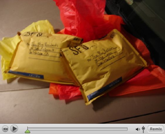 The idea was to go fast, but as Nicole stated, what would you do if you saw a car screeching down the road, turn a corner, and toss a fat yellow package out the window? We kept to the speed limit, I didn't really go for the side walk the first time around. Nicole commented that someone's going to run over a ton of lube and condoms unless the package gets picked up soon. There were enough people around. The 2nd package as tossed next to a few groups of peoples, I'm sure someone picked it up and took a look inside.