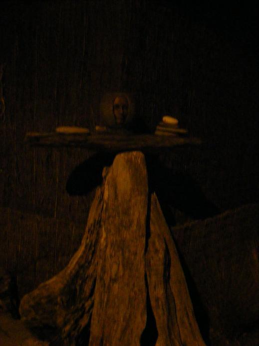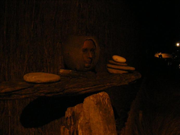 Following the street that leads to the forest, I stopped to snap shots as I reached each distant pool of light. I cam across another strange idol - the severed head of a woman set upon a rough wooden body. Slightly surreal in the flickering light of the misbehaving streetlight...