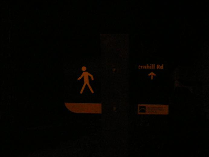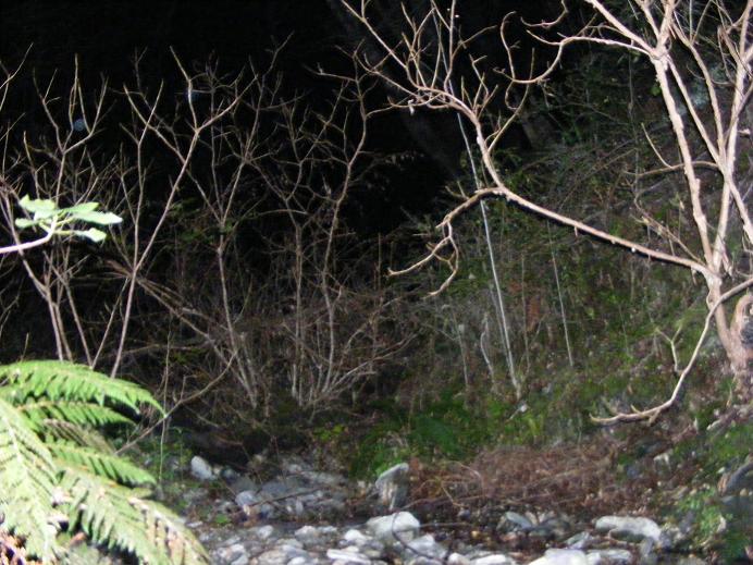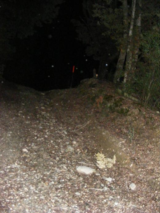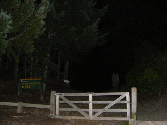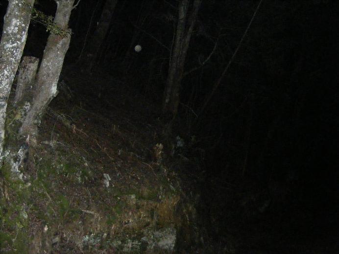 Coming to the gate blocking car access to the forest track, I crossed, waited 5 minutes with my eyes screwed shut, and then continued down the hill. A simple tip for those walking in the forst at night - shuffle. Not only does this save you from falling down cliffs, but it helps you find sticks to use to feel your path and prevent slips. I had remembered to wear black shoes too, as this helps you see your feet clearly against the ground without blinding you the way white shoes do.