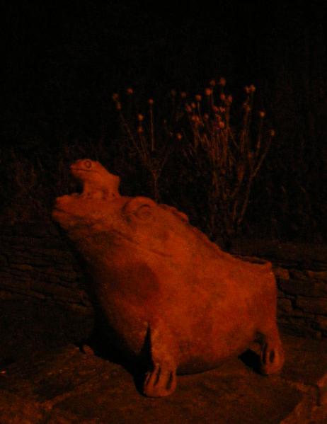 All of the streetlights here are sodium lights, which lend a warm glow to everything, despite the bitter cold. The trees rear up like withches fingers against the sky, and I discover an odd pagan idol squatting on a stone plinth.