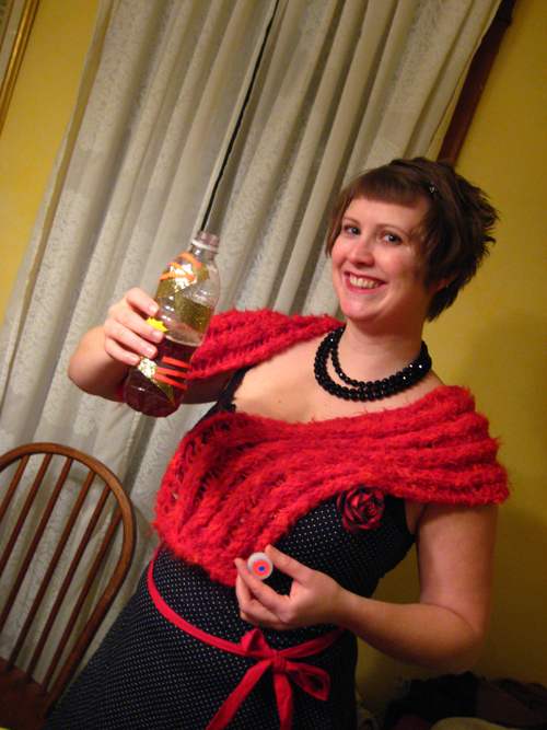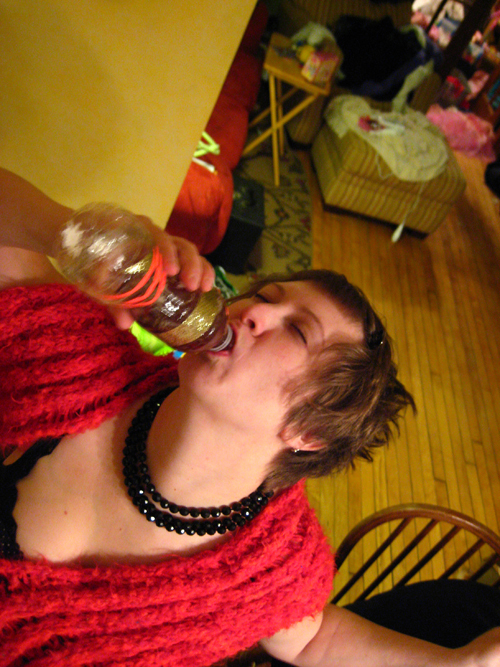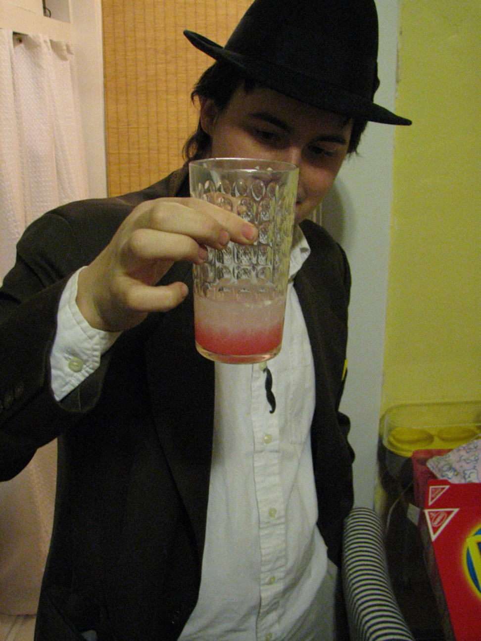 The challenge was to create a drink to match its container, a swirly glittery thing. Burn Unit's theory: put swirly stuff into a drink by adding jello. This is the first run.