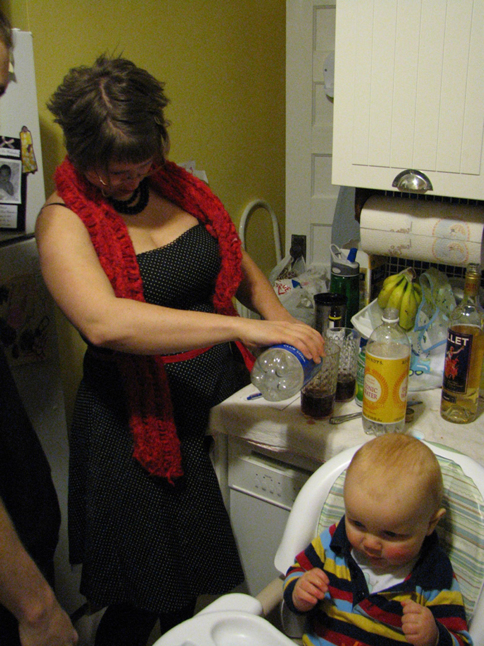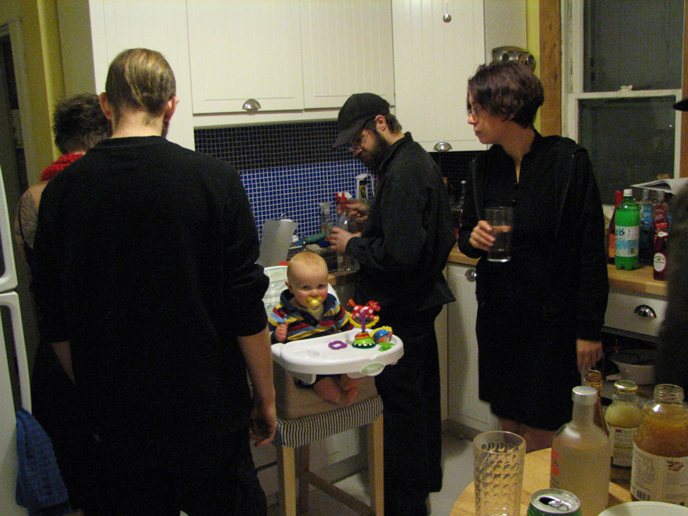 I remarked that Henry looked like he was in the center of some ritual or coven gathering. Take note of his outfit. That little stripey one piece is a real throwback to the leisure suit era, and we like to think of him as wearing it when he's partying. "Hey ladies!" It worked. Ink Tea was flirting with him all night. Inky, we plan to raise him to be very open minded. So in 18 or so years, you can call him, you ol' cougar! But listen up: you break my boy's heart and you'll have to answer to me.