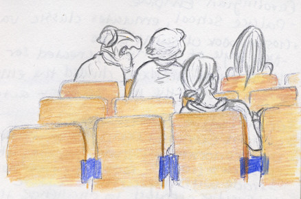I love this drawing, and not just because at first glance I thought the person at the front left was a Muppet.. first, second, third, fourth and fifth glance infact. Not glamorous you say? How glamorous is a muppet in (not)your art history lesson.