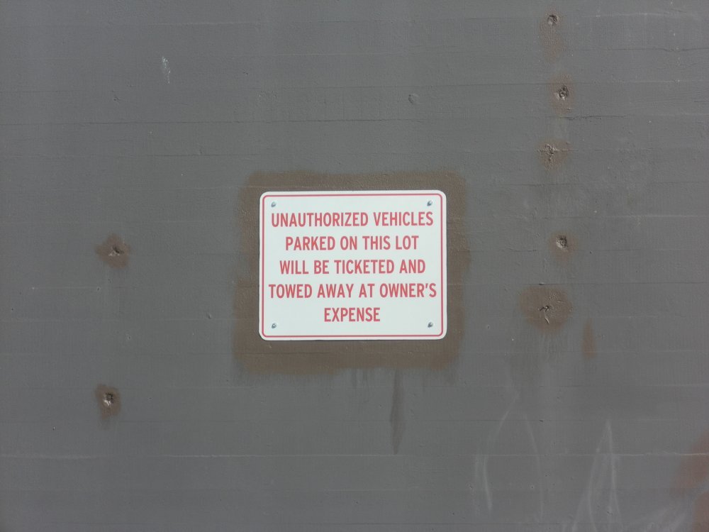 "Unauthorized Vehicles parked on this lot will be ticketed and towed away at owner's expense".