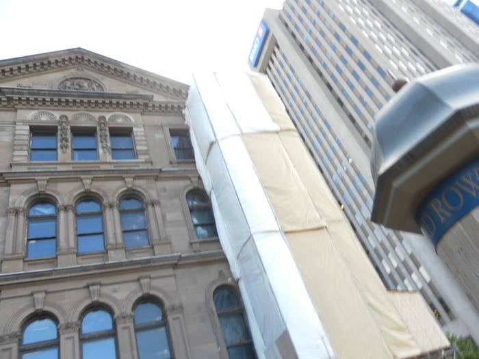 It may seem as though I have a dismal view of the future, but that's not the case. I just find the imagery terribly apt. Time affects us all, the unstoppable roll of the future demolishing parts of our lives and forcing us into putting up new ones, most good, some bad, many neutral. We inherit it at birth and we pass it on to our children. And, if given an even break, it will eventually kill us. All things besides, when you look at the persistent scaffolding and covering on buildings as you walk by, it's hard to miss their resemblance to tumorous growths, feeding like parasites on the city's history.