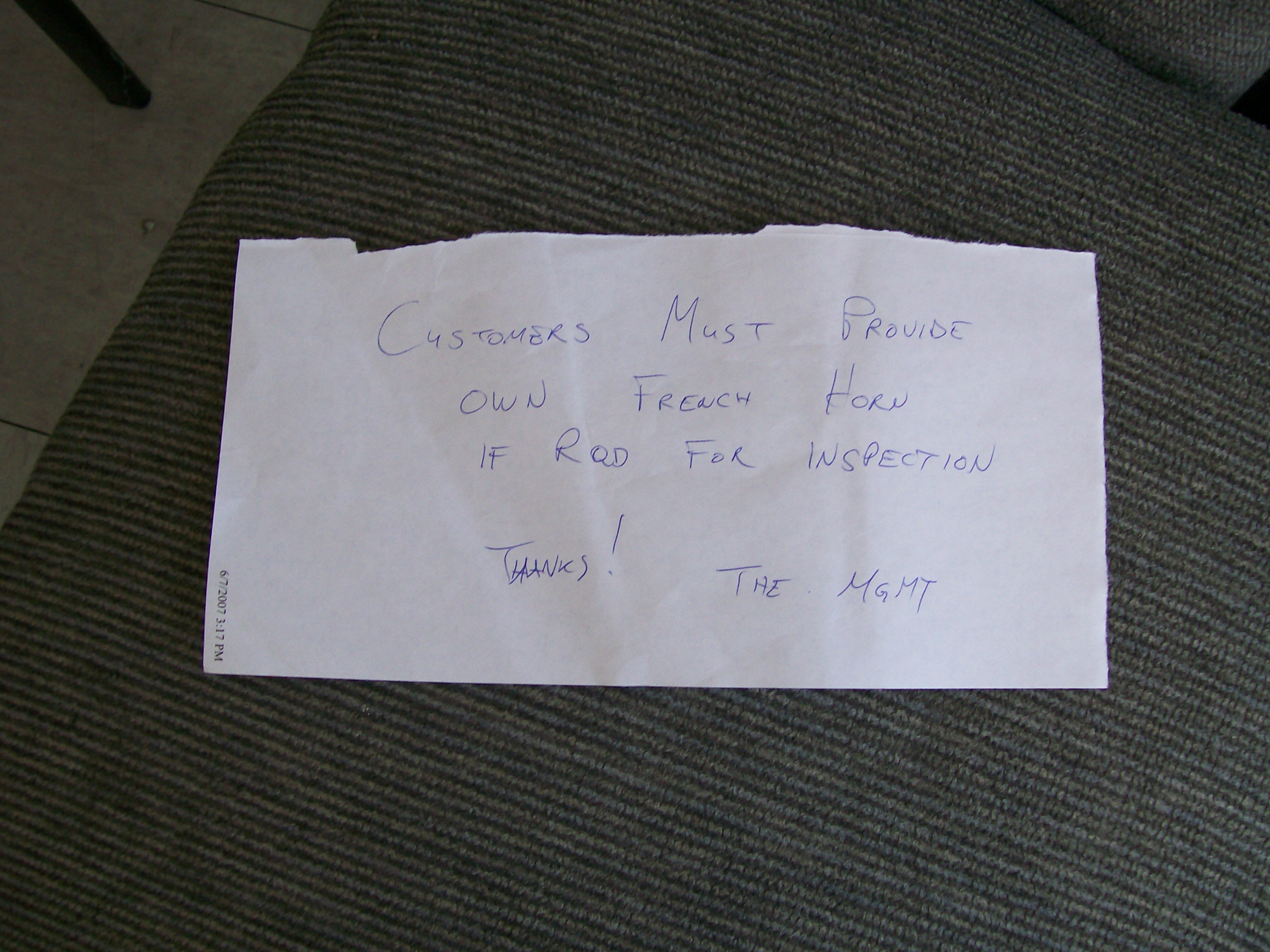 Oh....but what to write....please pay prior to getting smog check? well, that's not such an odd thing...I had to go more surreal, obviously. It is what Fran Drescher would want. She always sounded like a broken french horn. AHA! Inspiration.