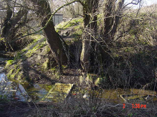 The puddles were everywhere from the melted snow, this skip was one of many that lined the steep banks of the yard