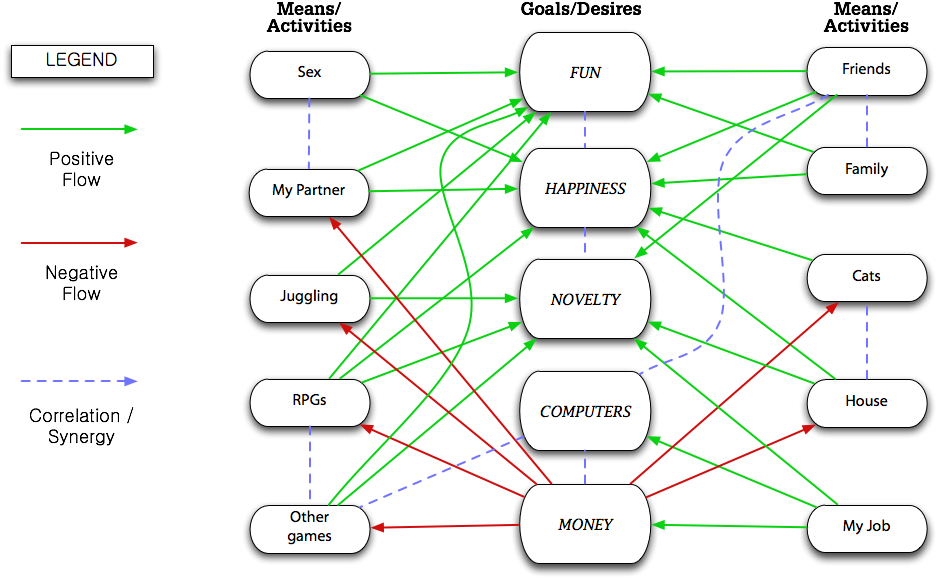 This essentially sums up the desires, goals, inputs, outputs and influences on my life. I think it's pretty clear, but is also subject to change without notice. I'm still pondering ways of representing more complex relationships, we'll see if I add later...