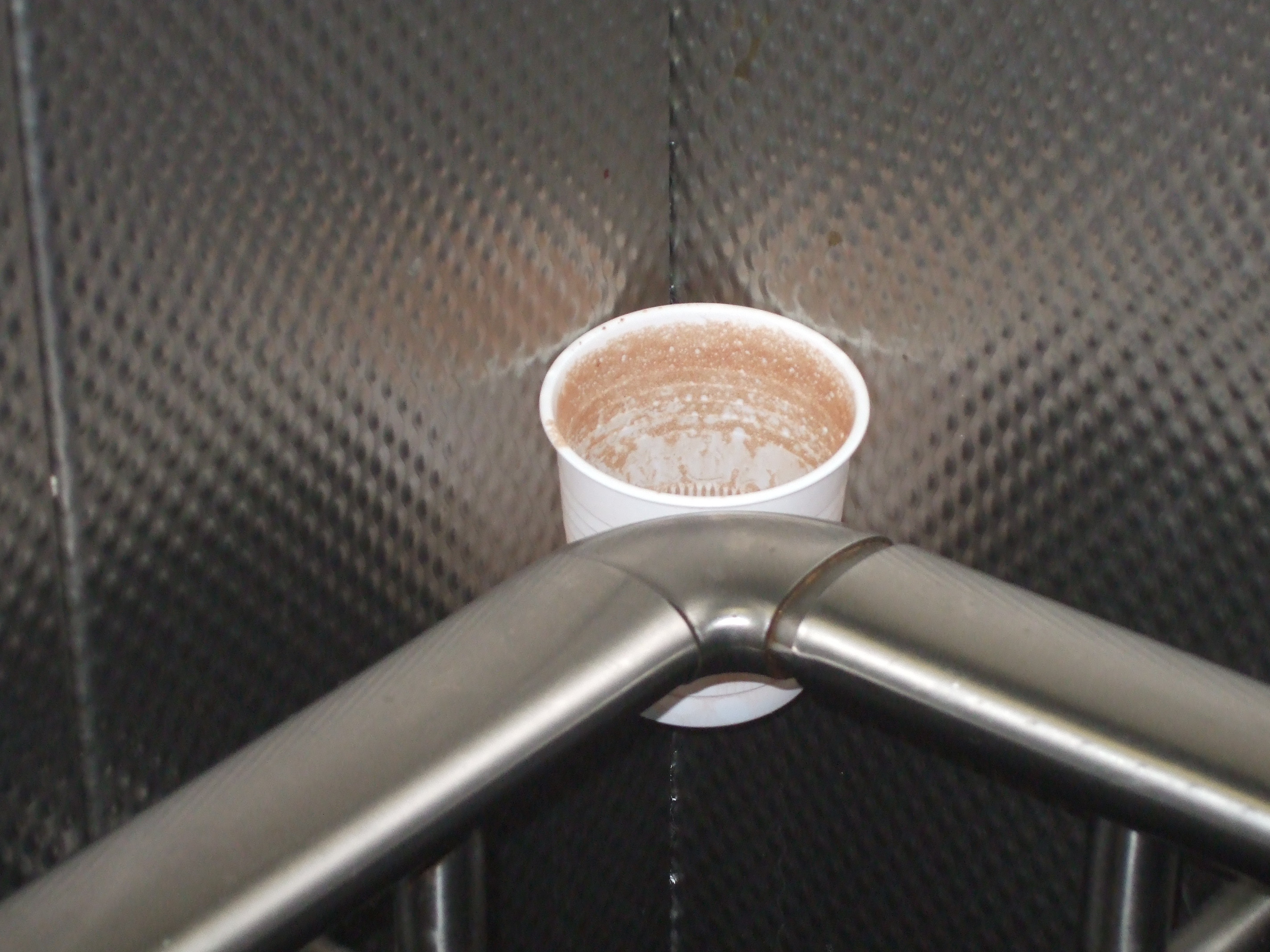 In a plastic cup." With apologies to Eddie Izzard for butchering his line. This was discarded in the odd lift. It was gone in the morning.