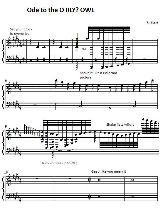 My jaw fell through to the floor when I saw Faerie's Aire and Death Waltz. Insanity, virtual insanity. I knew it would be tough to emulate that, I knew I wouldn't be able to. So, with limited musical knowledge (I can play, but I can't read music at all, pathetic) I ventured out onto a MIDI composer entitled Noteworthy. I named it 'Ode to the O RLY? Owl'. I don't know why.