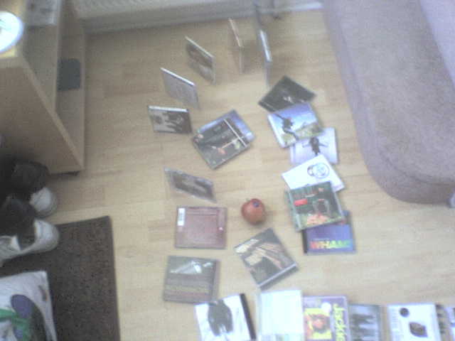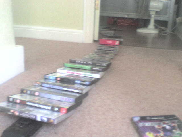 Mostly complied of CDs, DVDs and video game cases, this long trail of dominoes took three attempts to work. It started off by me turning on a fan, and then blowing down CDs. It then led outside my room, and then hit an apple which made its journey down the stairs. It then knocked over the rest of the CDs on the floor. After that I realised I hadn't recorded... or well, anyway. So I trudged off into my room with the freshly-dominoed floor and took pictures on my cellphone.