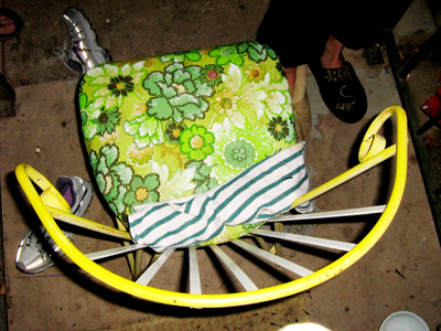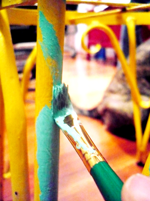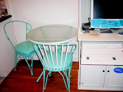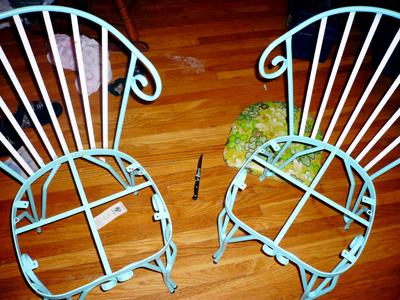 My mom bought me this cute bistro table a while back. The colors were awful, yellow and white with yucky yellow vinyl seat covers. So I decided to revamp it. This was my first time attempting something like this.