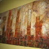 I had been wanting some art to hang on this yellow wall in my room (i did not choose the yellow) and one day found this piece in the weeds near a construction site. It is wood, with a city scape painted on it in yellow / orange / red tones, with nai...