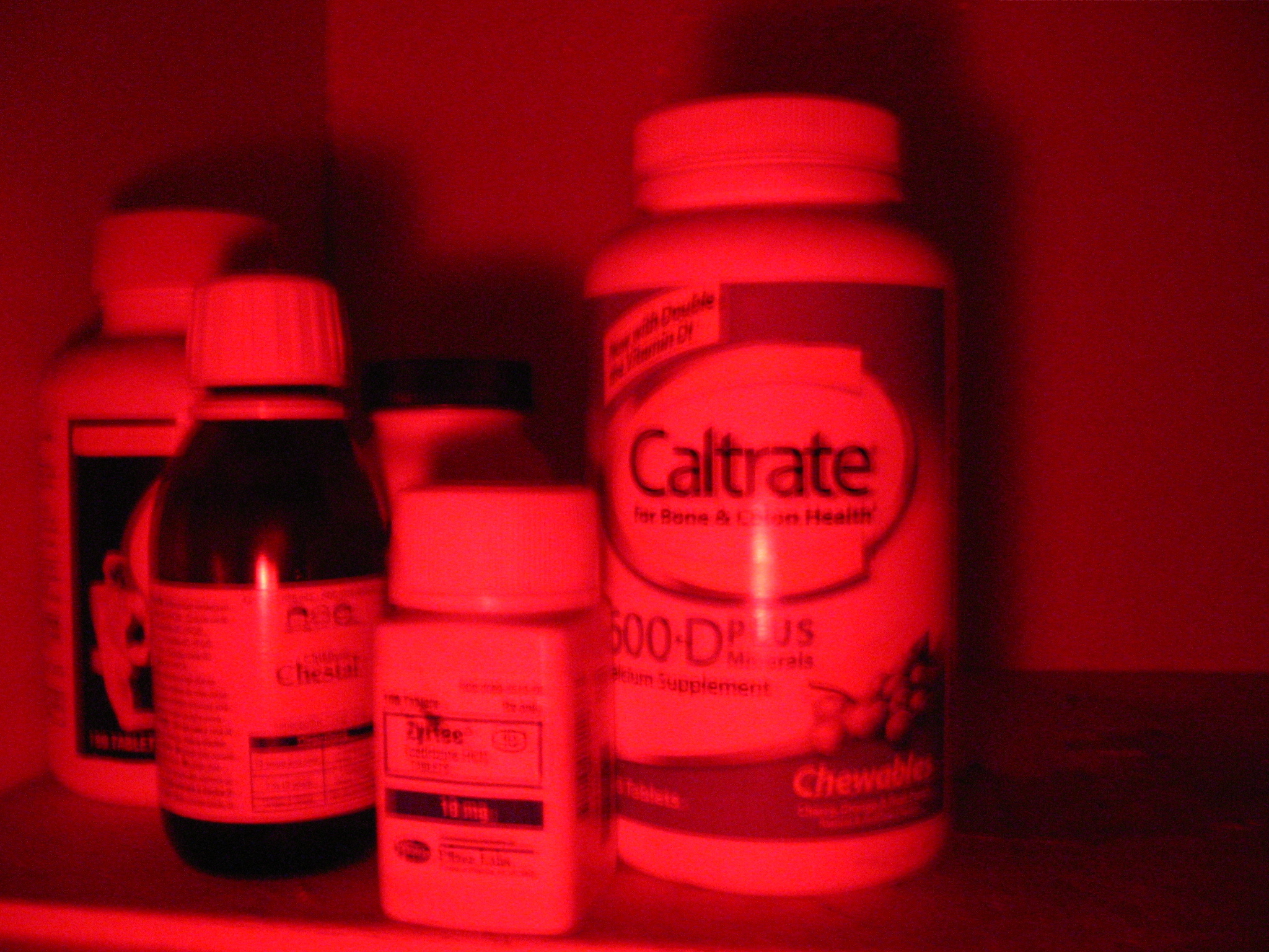 Vitamin supplements, and what sounds like a full bottle of Zyrtec.