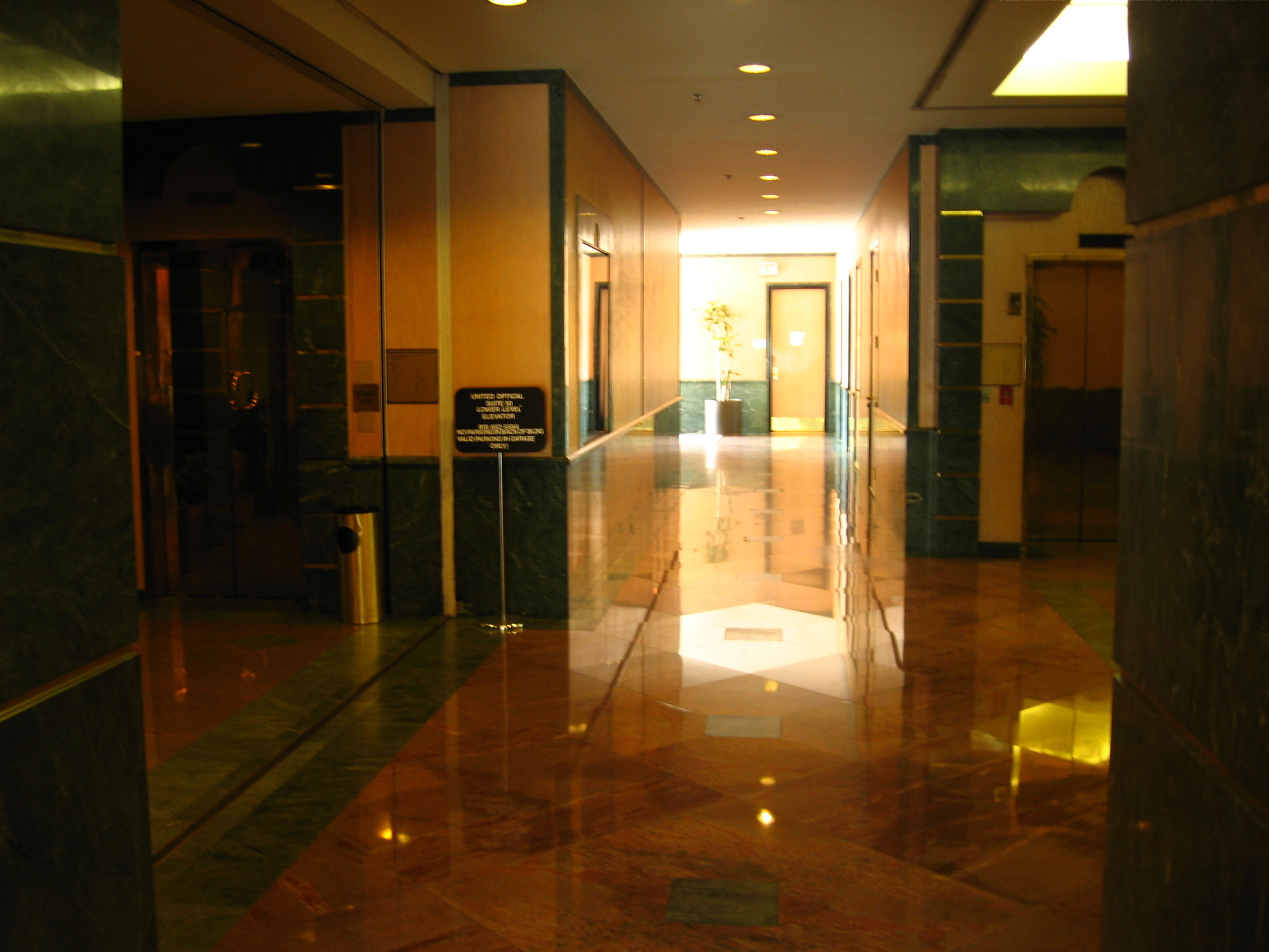 The lobby was empty and dark though, it didn't look like anyone was there.
