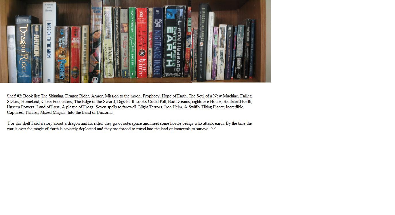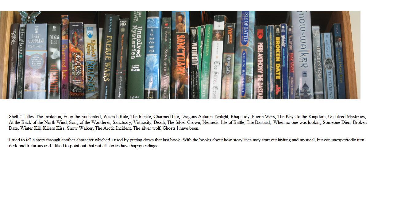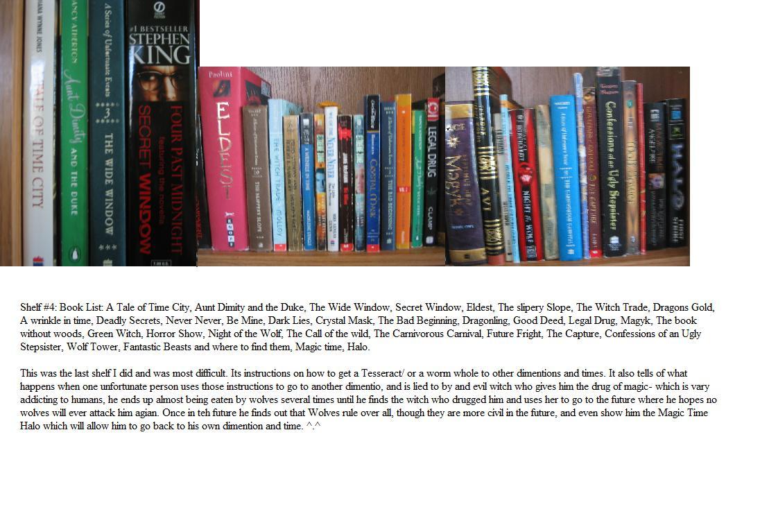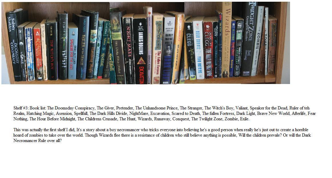 To Complete this task I reorganized the books on my bookshelf to tell a story, I tried to do the whole book shelf but by the time I got to the fourth shelf they were starting to loose meaning and were full of lack of sence. Due to this I decided to also go and clarify the story line. So I went through and took pictures of the shelves and I put them together in paint and then I realized the titles were difficult to read so I wrote down all the titles in lists. Since I started by trying to do one shelf theres one that makes a lot more sence then the others, *the third shelf* , But they all have their own unique story lines.