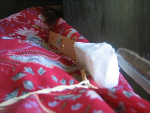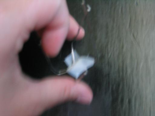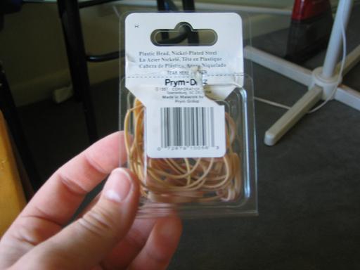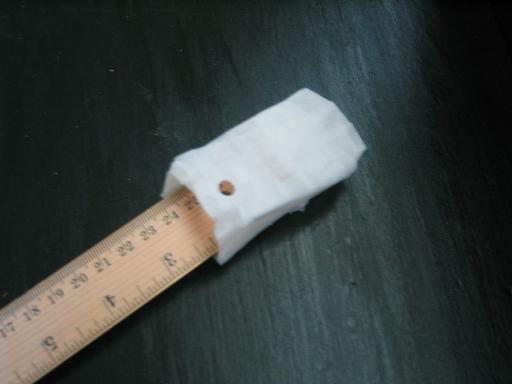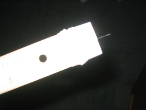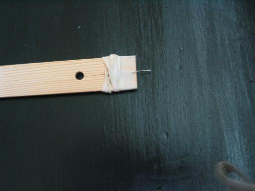 A ruler I’d been trying to turn into a sling shot accidentally got a slit down it’s center. A SMALL slit which opened onto a hole that was already in the ruler. A thought occurred to me that one of the pin needles we have could fit into the slit perfectly. The idea struck me as funny at first, but I decided to try it anyway. The pin fit, and while it was a perfect fit it still needed something more. To make sure it didn’t fall out while in use. So I put scotch tape around it where the slit was, knowing that the ball on the end off the needle would keep it from coming out through the slit I tried to take care of the sides like that. However the realization that cheep scotch tape hardly ever works well hit me quickly, so for extra protection I added a rube band around it, in case the scotch tape failed. This also helped keep the ruler tighter together and prevented the needle from moving, or wiggling around.