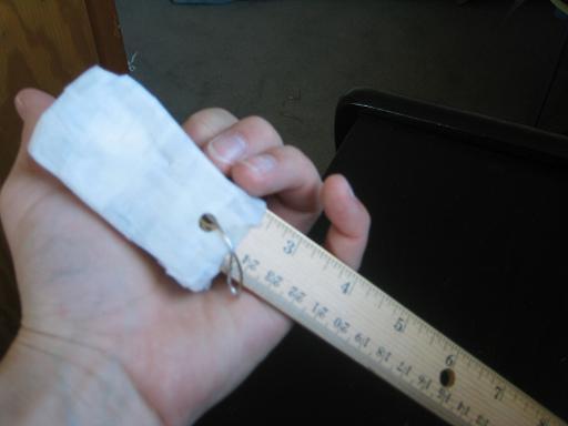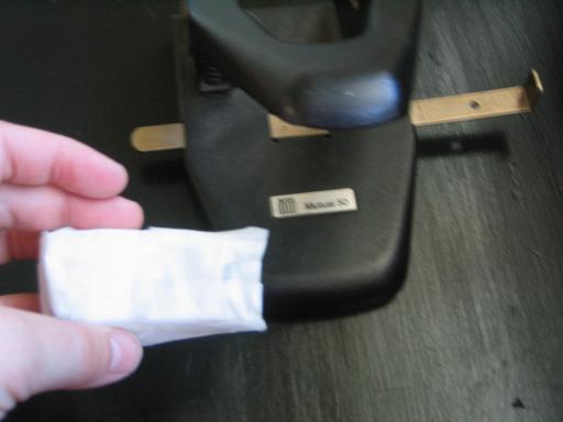 There it was, my home made office supply weapon- good for sneak attacks. Of course, all weapons should have proper sheaths. So I got some paper clips together and folded them into the right shape, taped around it on both sides so the inside wasn’t sticky, then I whole punched it so that I could hold it onto the stick with a paperclip.
