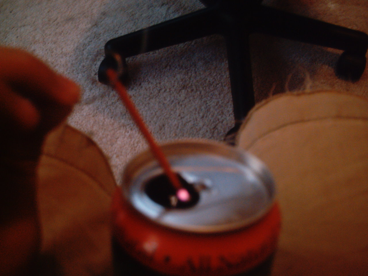 then, after blowing it out to an ember, i put it ember side down into the can opening, with the protruding paper clip lengths holding it from falling in