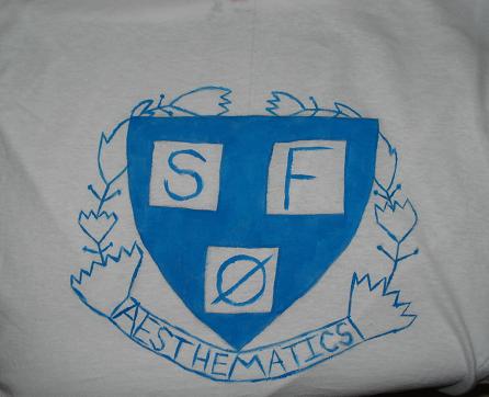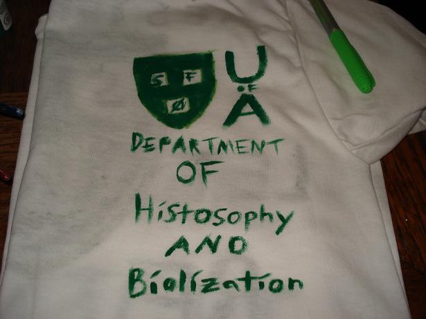 The Revelator's shirt is in green, with the SF0 shield on the back, with the UC motto - "Let there be light," underneath. Please forgive the poor letter-spacing on top. The front displays the various University departments The Revelator belongs to, Histosophy and Biolization.
