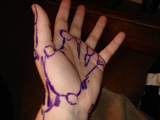 For this task, I felt for all of the bones and tendons in my left hand, and outlined them with purple and black sharpie. I circled more prominent features and drew lines for tendons and longer bones. For the palm, I outlined prominent muscles and bones.
