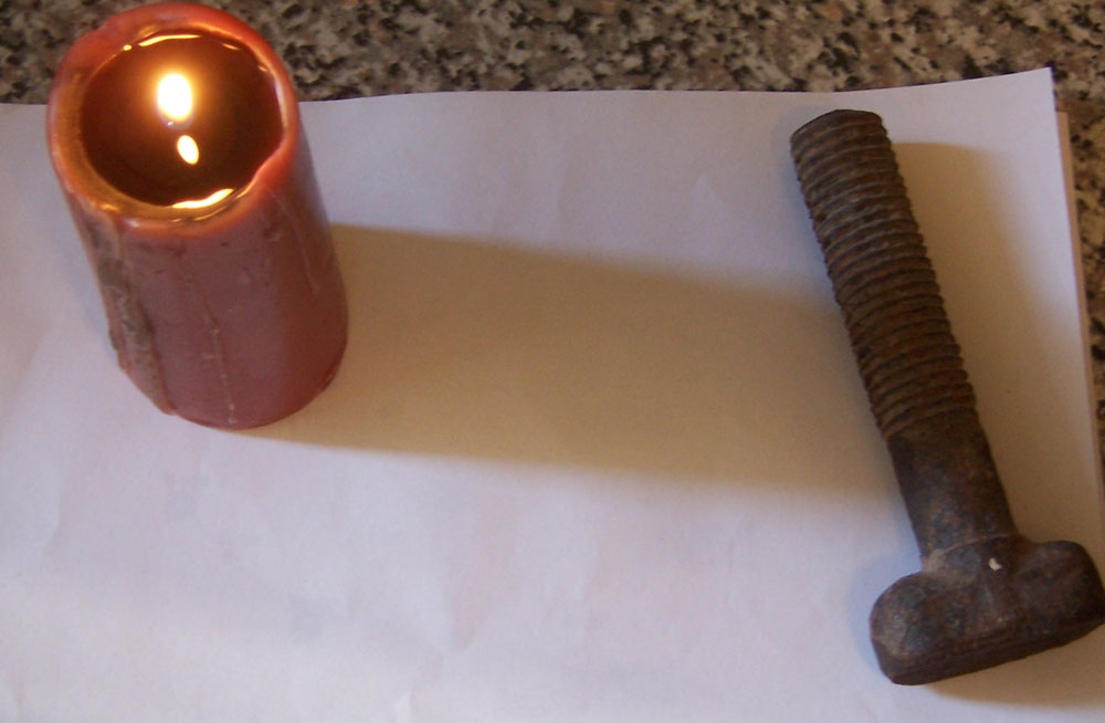 First, I documented some of my slicey aftermath. Then I dove right into the sealing. I procured a suitable wax source and an ignition device. While walking around my apartment with a burning candle, I searched for a suitable seal. What to use? Nothing was really proper for the job and the candle was about to gutter! Then I spied a rusty piece of hardware that lives on my bedroom radiator. Excellent. With all the necessary tools, I moved to the kitchen where I laid out some counter-top protection and performed the wax application ritual. Ouch! Well that was to be expected. Next came the rolling of the seal across the arm. Good, good. As you can see, it came out simple, but lovely.