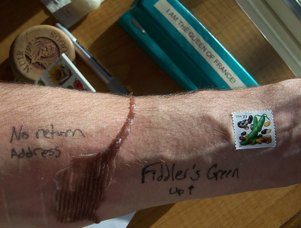 After a moment, I decided that since I'd gone through the trouble of sealing my arm, I may as well address it and apply postage. I was going to go to the post office to mail the thing, but I just couldn't let go. I love you, arm!