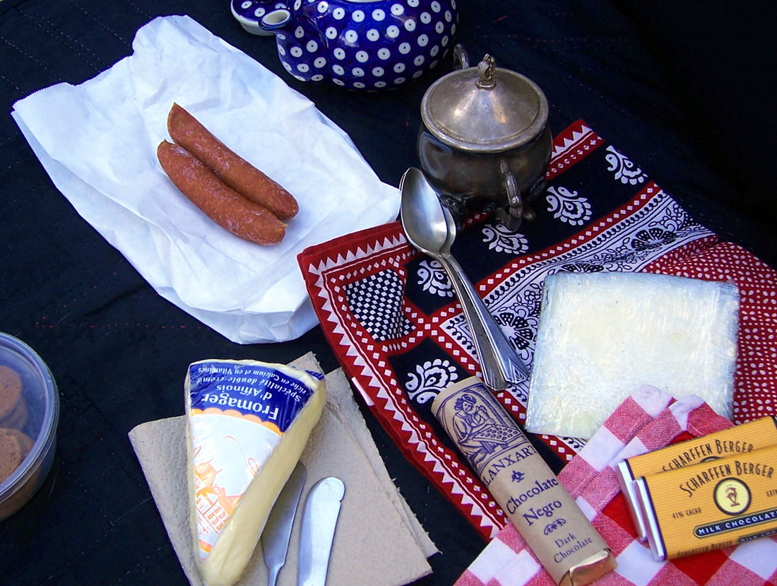 On the day of, I took care to set aside plenty of time for aquisition of comestibles. Finding the sweet baguette was no problem, but my store was out of brie! Not even a scrap of camembert was in the shop. That's right. I was having a cheese crisis. A bit flustered, I headed to BevMo where I have never purchased cheese, but have often noted the large pile of it in inbetween the wine and liquor sections. With no time to lose, I high-tail it to BevMo only to discover that their decent selection of soft cheeses is oldish and poorly refrigerated. Moldy and scary. Nooo! Fortunately I manage to procure a wedge from a market on my way home -- but at what cost? I pack everything up in my wicker case and scurry out the door 20 minutes late!