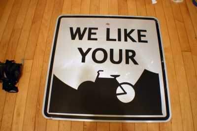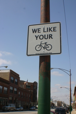 The hanging of the sign was delayed due to a severe Chicago Winter. In late May, bicyclists finally returned to the Elston Ave bike lane.