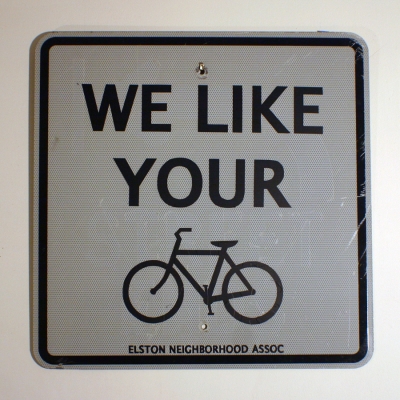 The sign would eventually be hung on existing collars on Elston Ave, where it was originally found. This would place it on a major bike-commute route, on the Northwest-bound side of the street (evening commute).