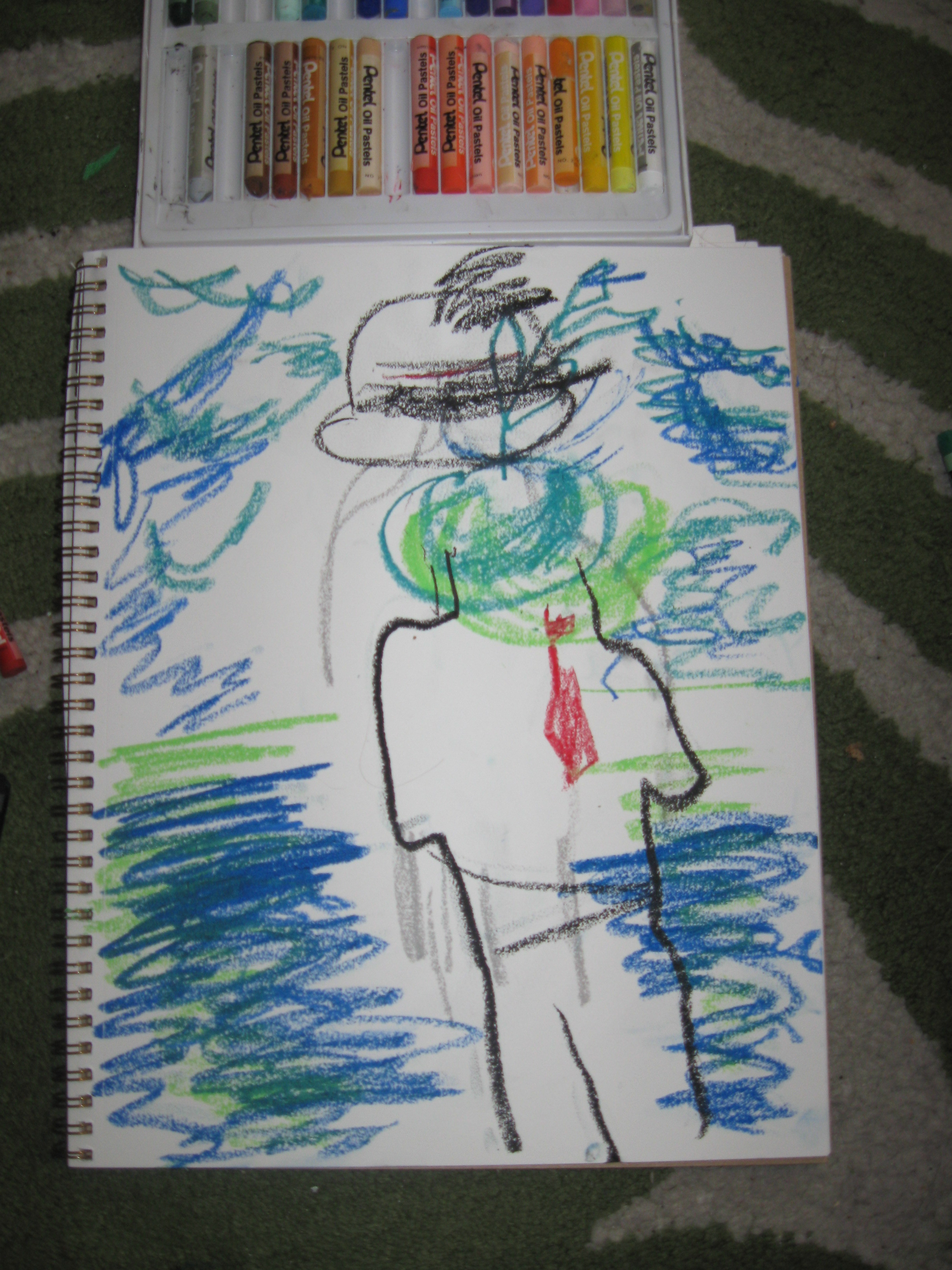Because blindfolded painting seems like an especially messy prospect, I used pastels. I arranged them by color around my sketchbook, so I'd have a better chance at accuracy. I thought that I might be able to feel the marks on the page to keep everything lined up, but that was only semi-effective. My color sorting system worked pretty well & most of my copy is appropriately colored, though I probably should have chosen a lighter blue for the sky.