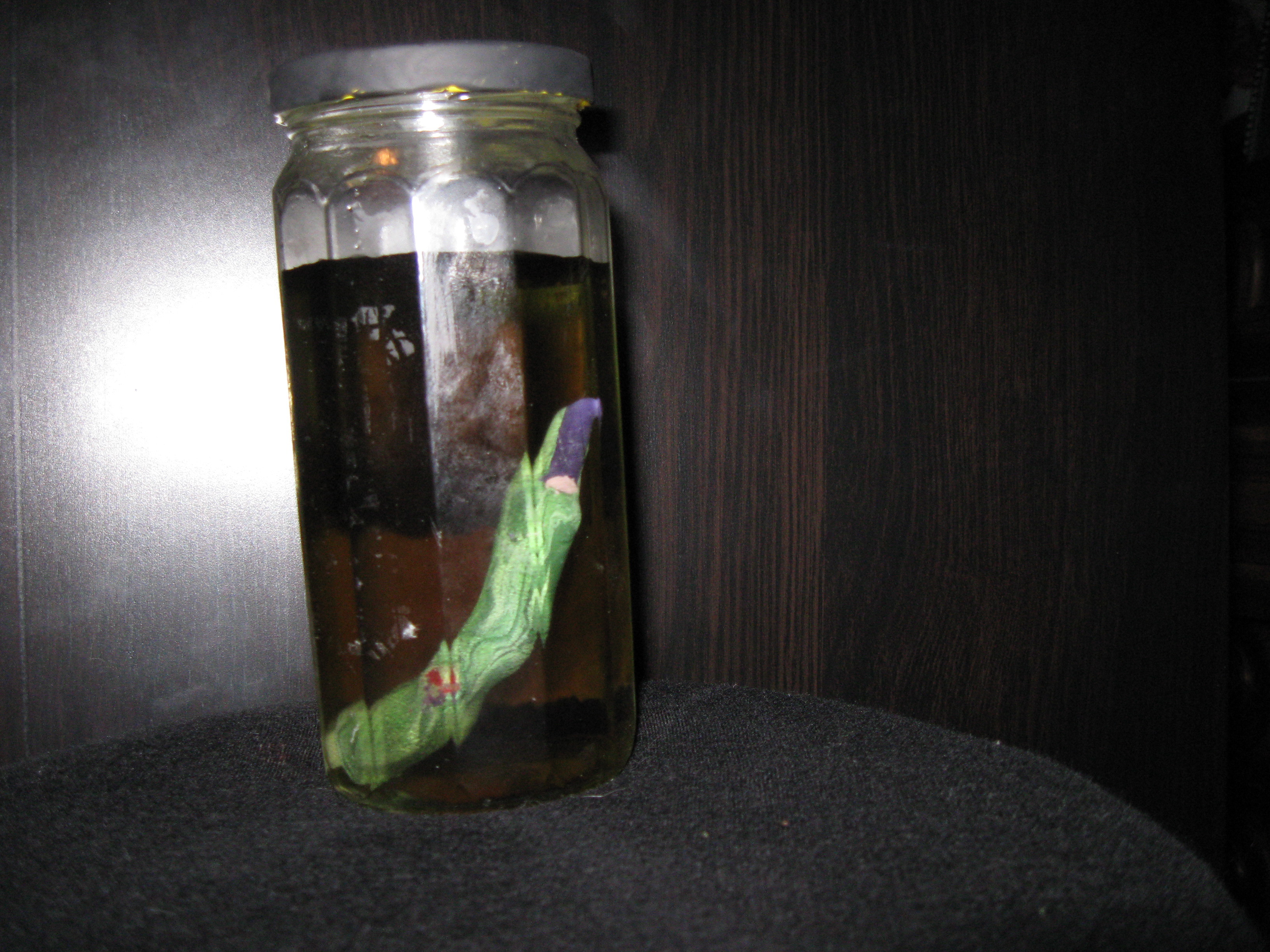 It is unknown how Aloisia contracted the virus, but it is believed to have happened in the field as she attempted to save zombie victims from sharing the fate of their attackers. What is known is that Aloisia was able to vaccinate herself & amputate her finger. Not being one to waste an opportunity, she preserved her severed digit in a handy specimen jar and placed the finger under close observation in her lab. Her writings (which will be made available in another task, at a later date) indicate that the finger continued to move for a fortnight.