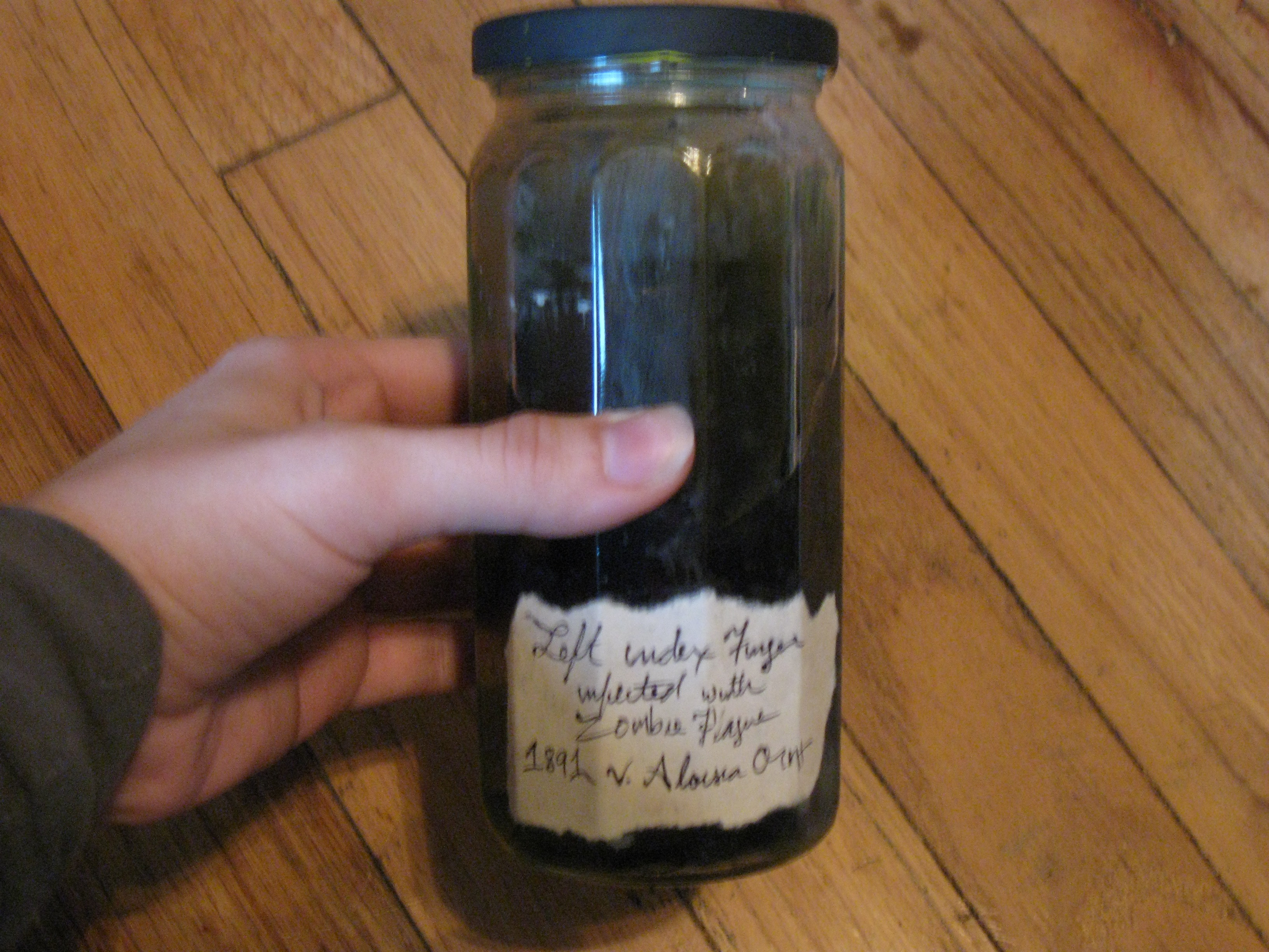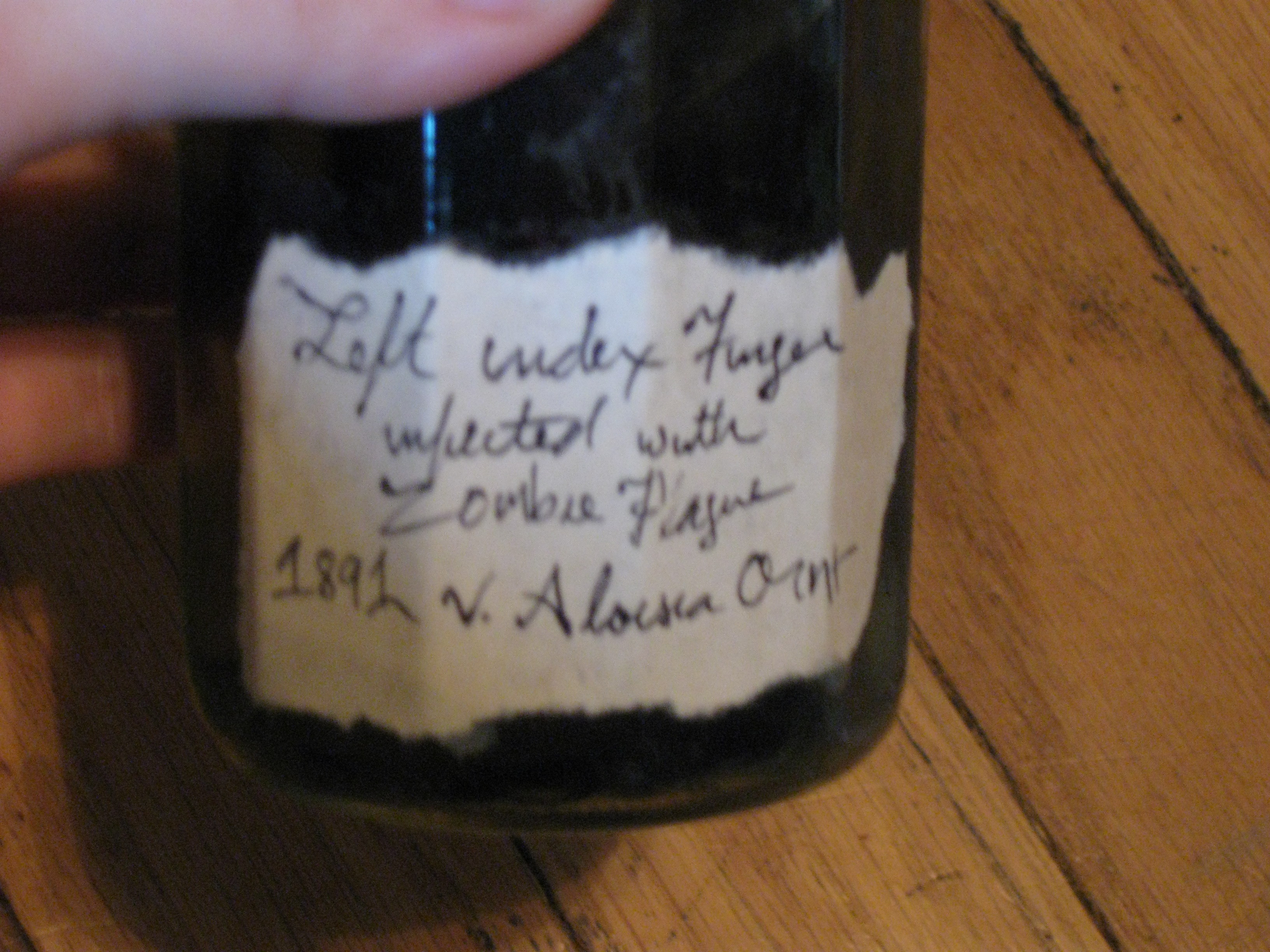 the label reads, "Left index finger infected with zombie plague, 1891. Victim Aloisia Ornt"