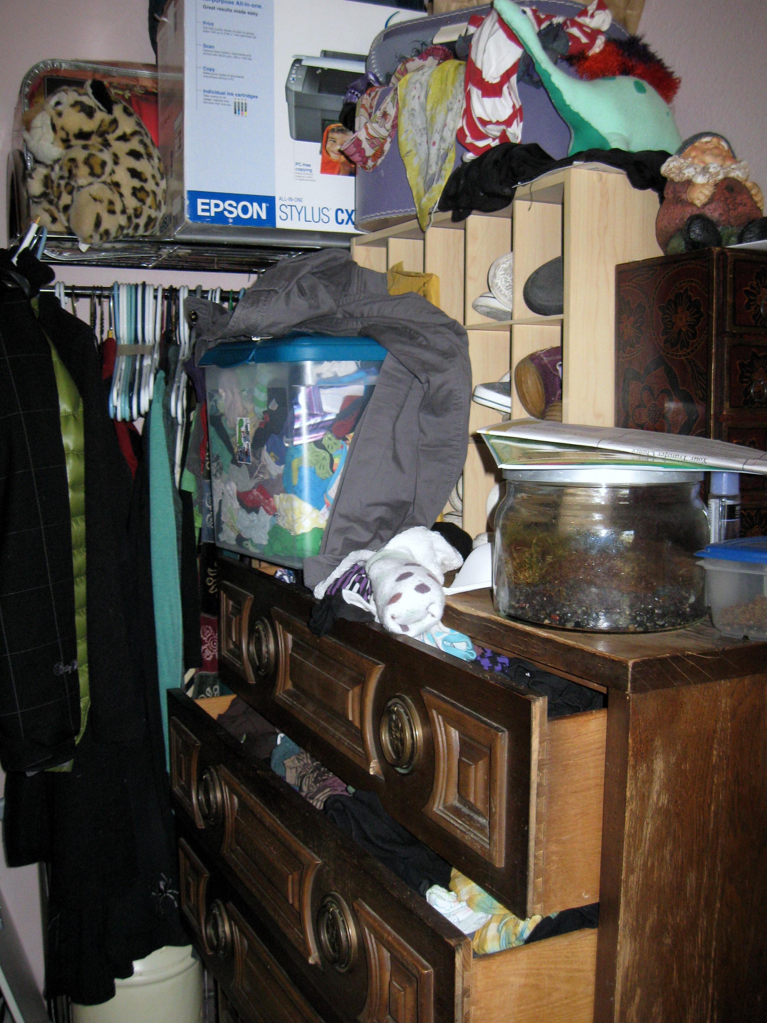 After the shower, I dressed myself. This is my "closet". My parents' guest room doesn't have an actual closet, I partitioned the room with a bookshelf & shoved my dresser & a hanging rack thing back there. Though it lacks walls, it does have a lawn gnome.