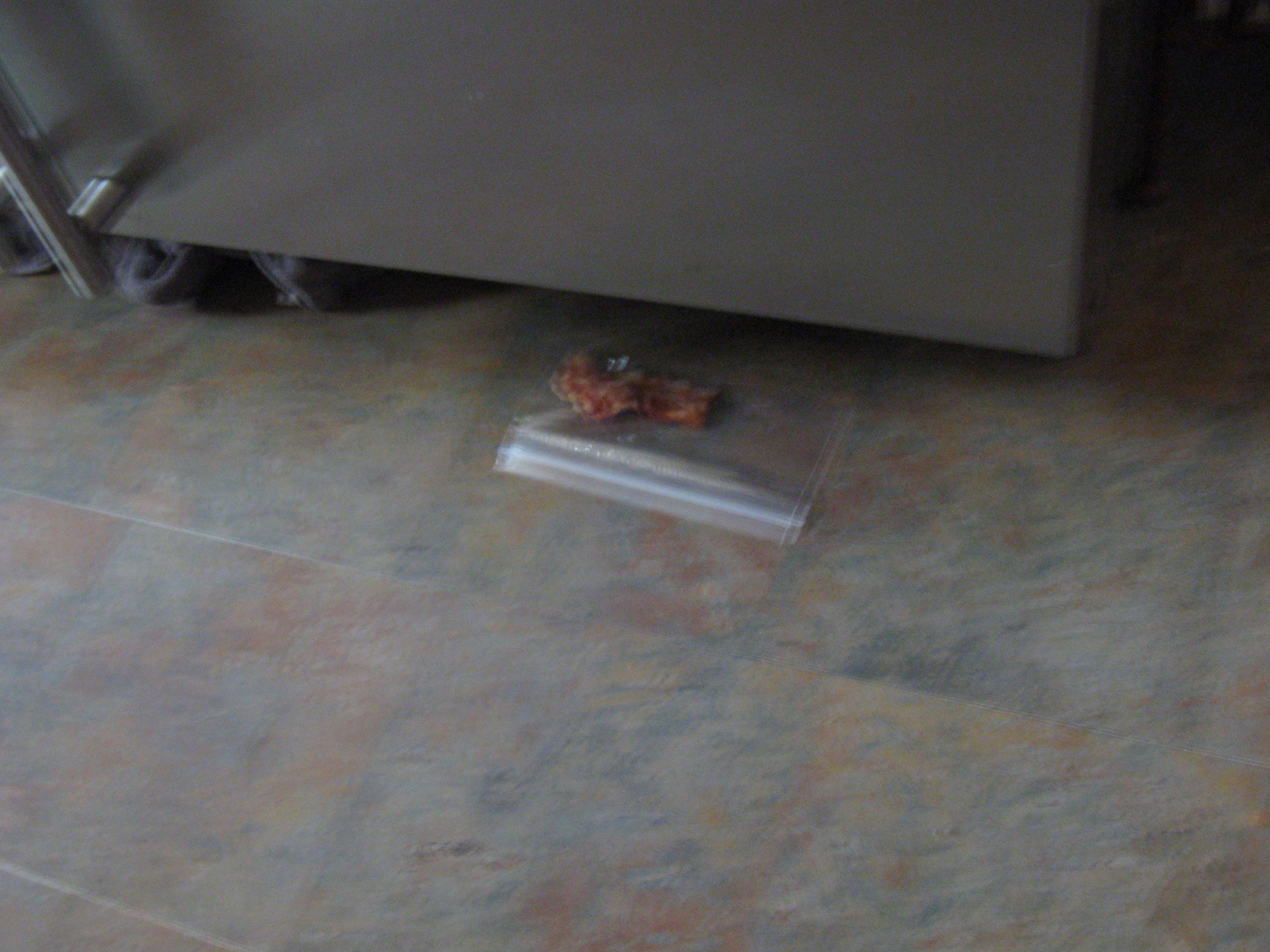 There was some bacon on the floor. Once again, I decided not to clean it up. Not because I'm a slob so much as because it's interesting to see other people find things like bacon on the floor.