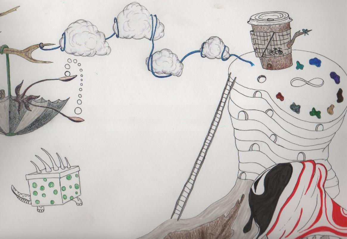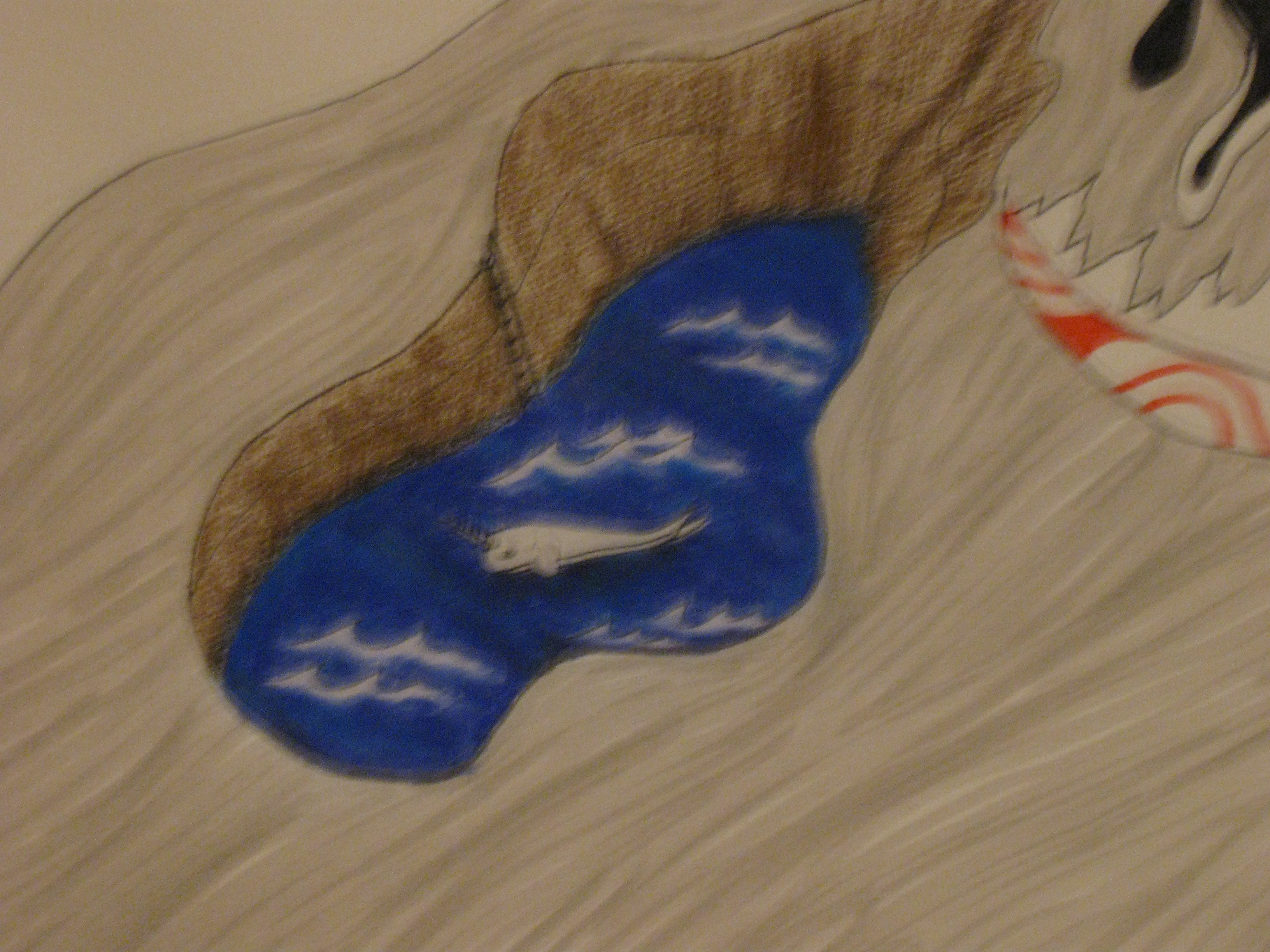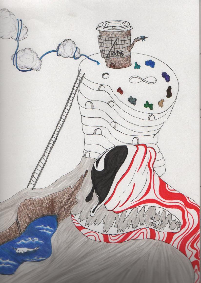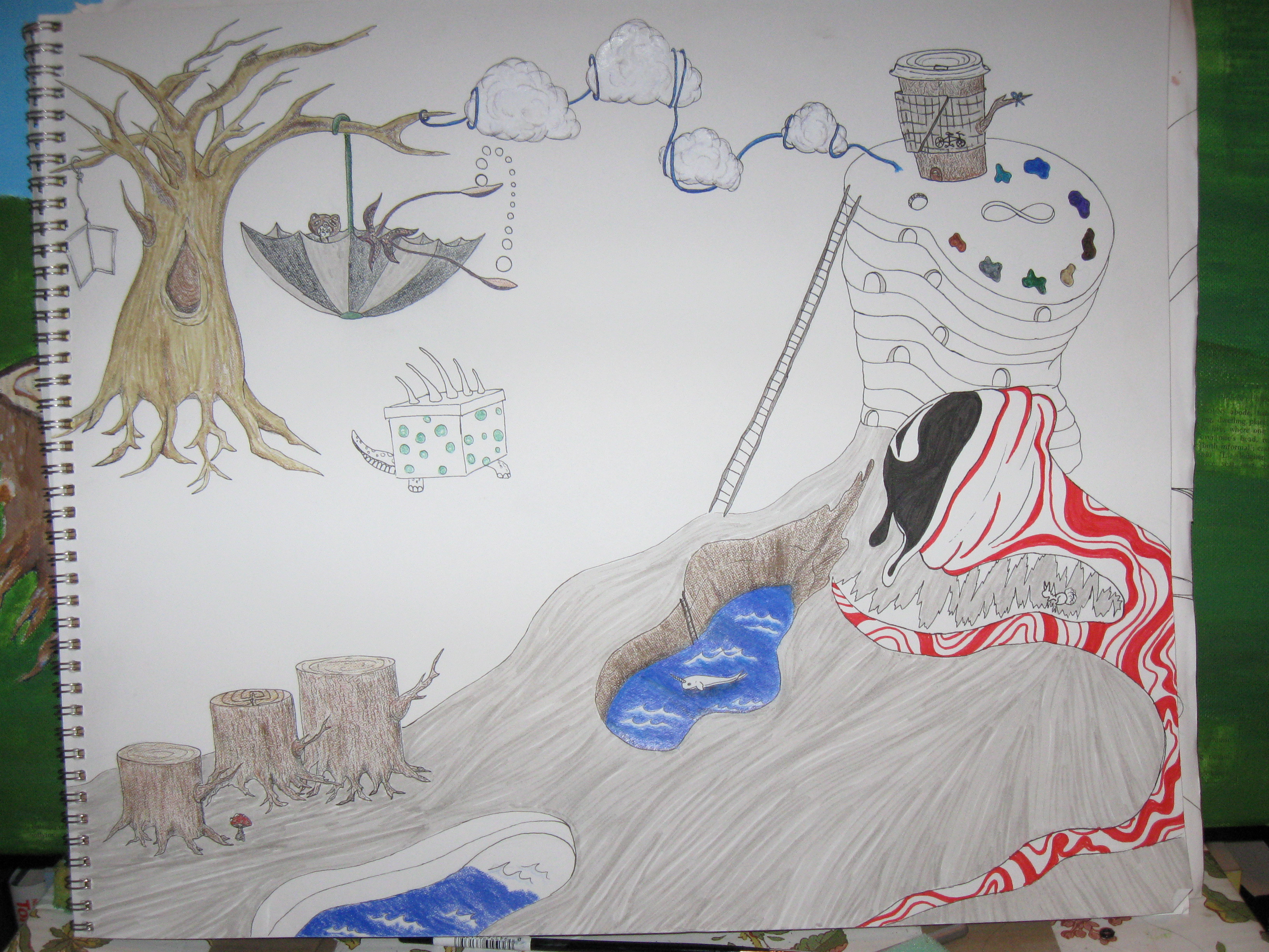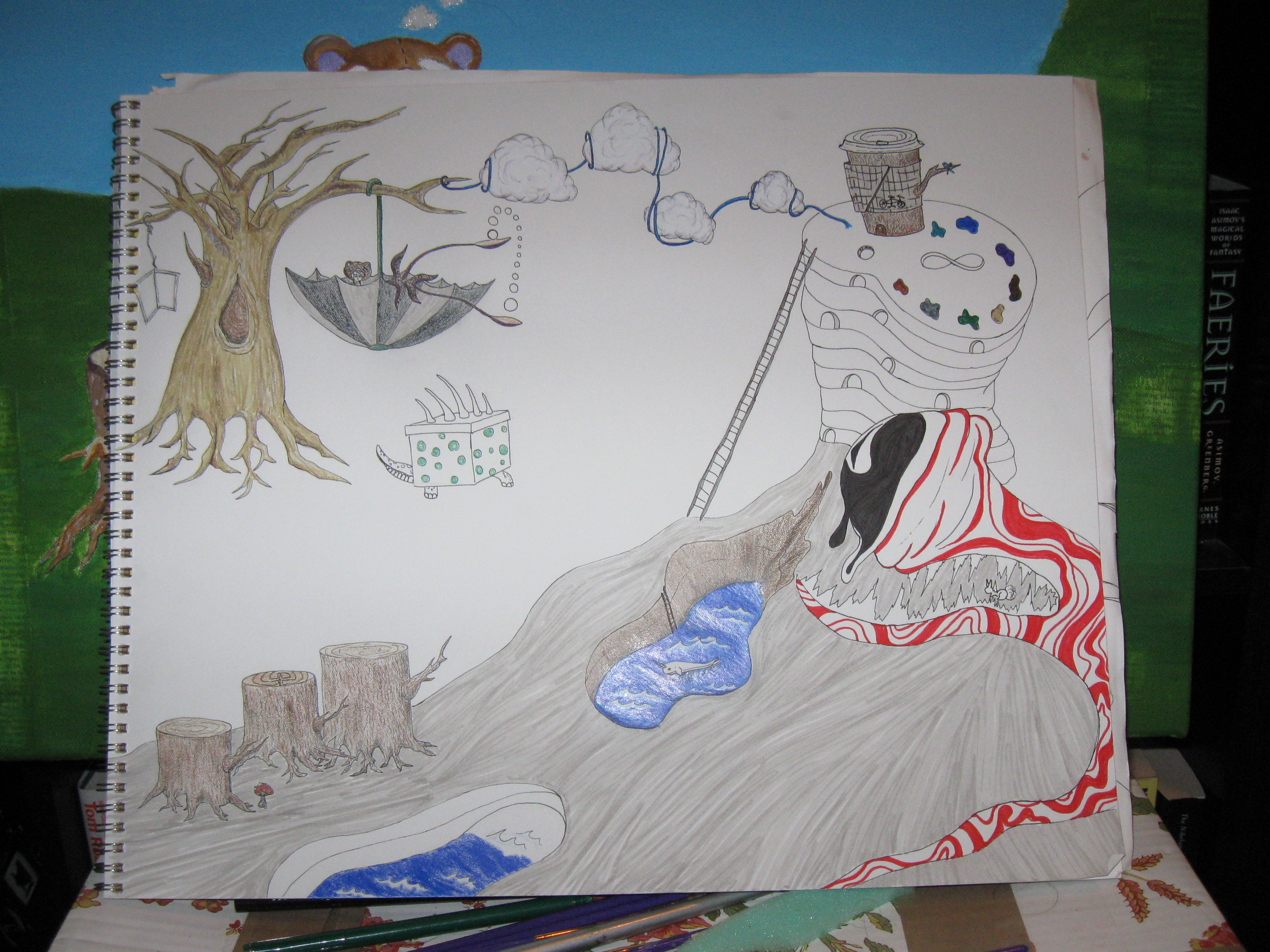 The mountain-pillar thing with the wooden coffee cup atop it is Portland, where I'll be attending art school in about 6 months. The creepy eyeballmonster in the right forefront is fear, anxiety, & everything else that makes me think I might end up trapped in the dark water-filled pond of nowness. Luckily, there's a lovely albino narwhal in their with me, which I've decided to take as a good omen.