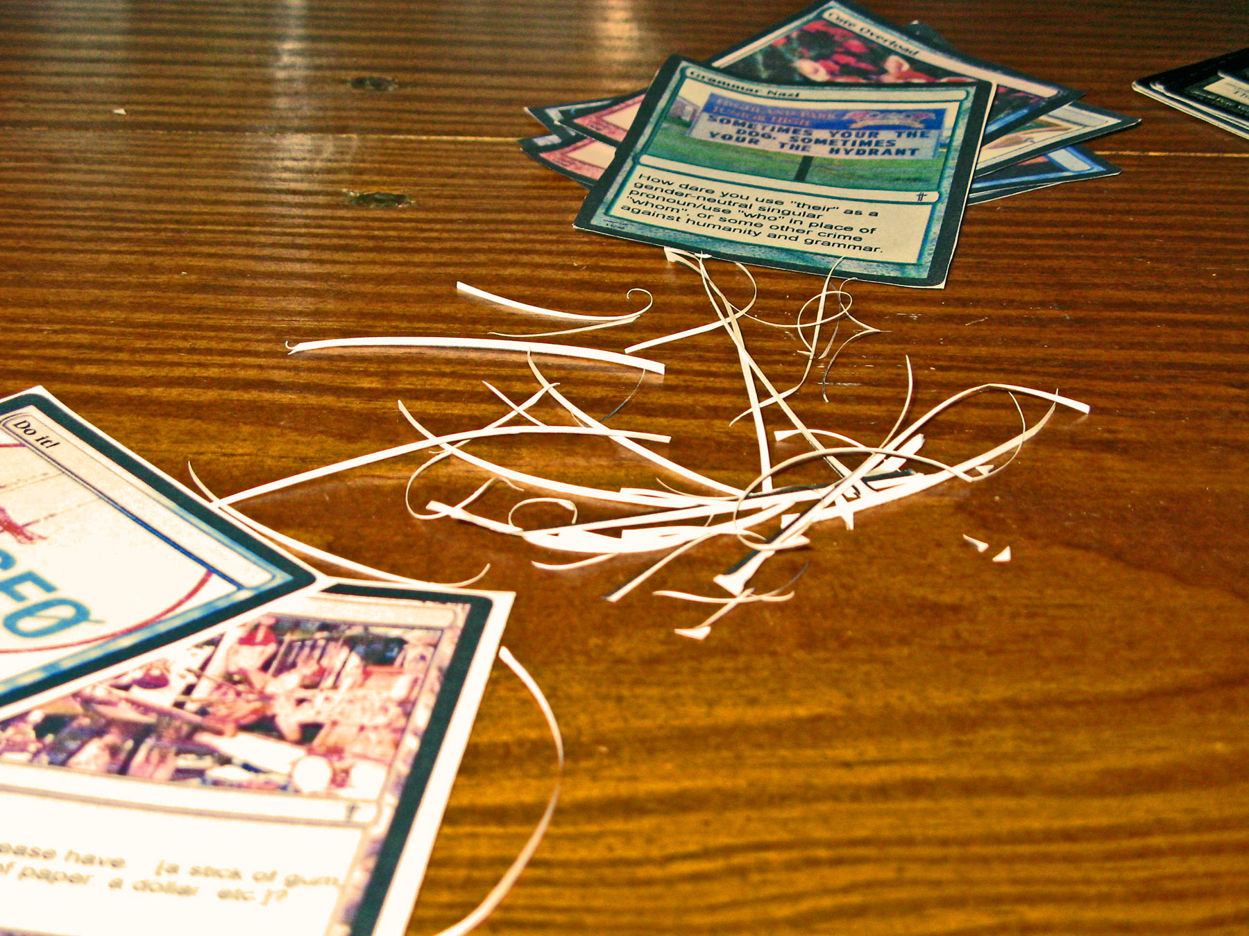 I pulled them out at various times throughout the days when I used them. Long arguments seemed to be the best openings for them. Reactions ranged from, "What the hell?" to "Hey, let me see the rest of those," to grabbing the card and chucking it across the room. None of the cards were destroyed, which made me happy.