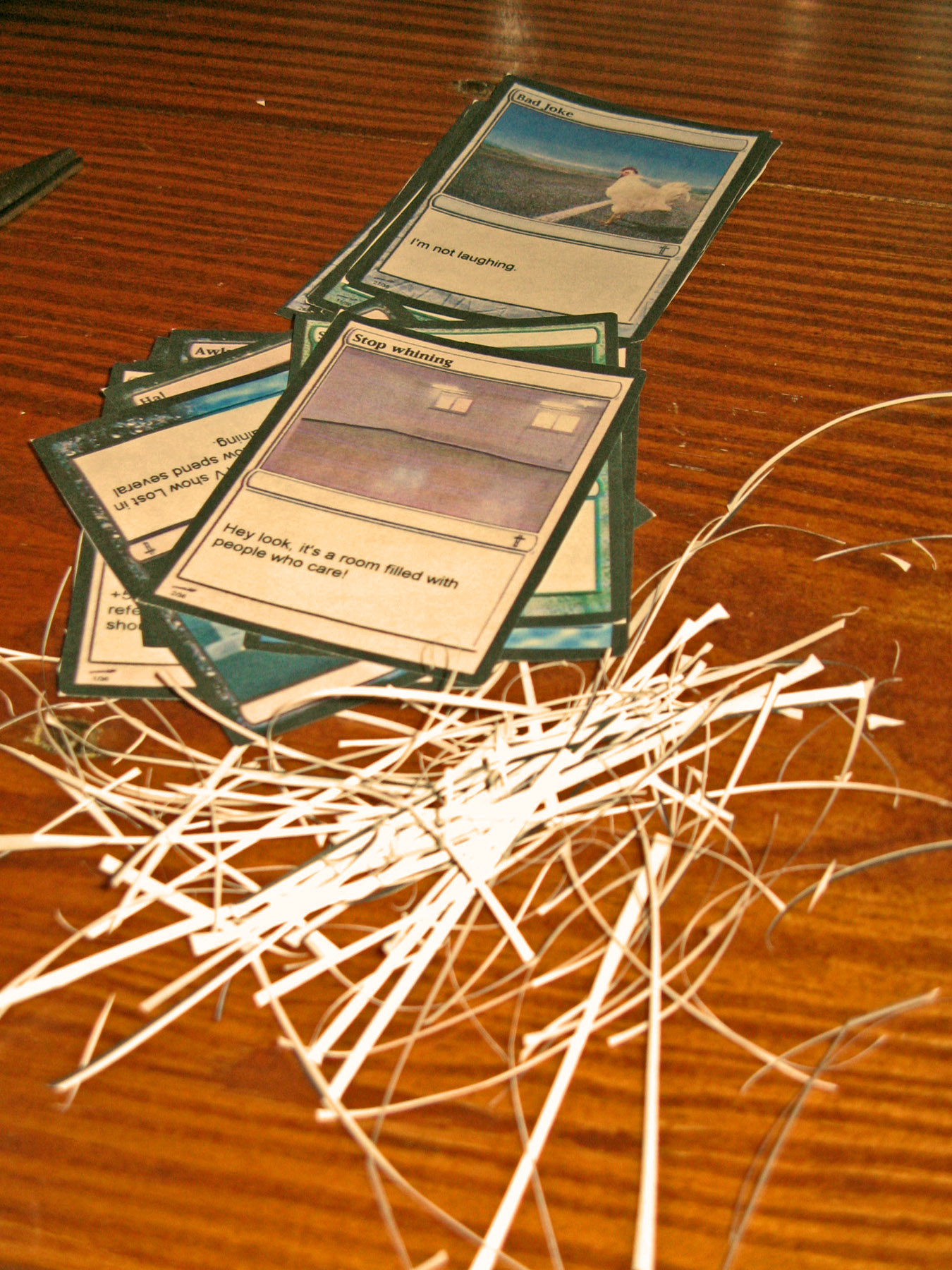 The first step was the design of the cards. This took a lot longer than I expected- several weeks. It was pretty slow going. As I went, I added an image to go with the card (and a colored background to make them easier to pick out of a stack and to complement the picture). I did try to keep the cards from becoming overly angry/pessimistic, but apparently that's all I could come up with, because a fair amount of the cards are some variation of "shut up."