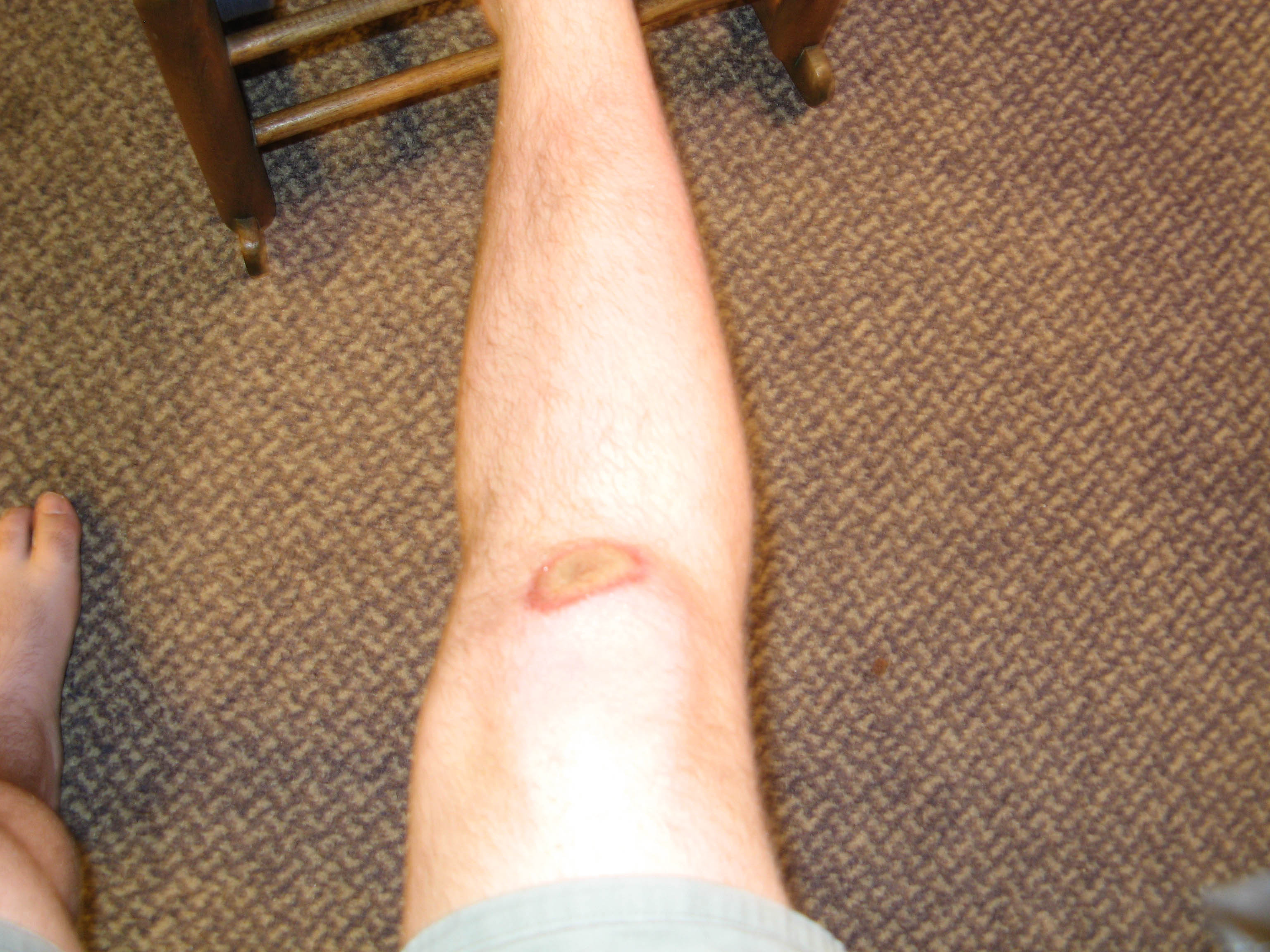 And time is still healing. I skinned my knee on concrete pretty badly. For the first few hours, it oozed blood, and then within 24-48 hours it took on the state you see here. It was very painful for a few days until the wound started to scab up. Then, the scab would loosen in hot water and partly come off, only to reform. This went on for a couple of weeks until it was mostly just raw fresh skin. It is still very obvious where I skinned the knee, as there's a big pink patch there.