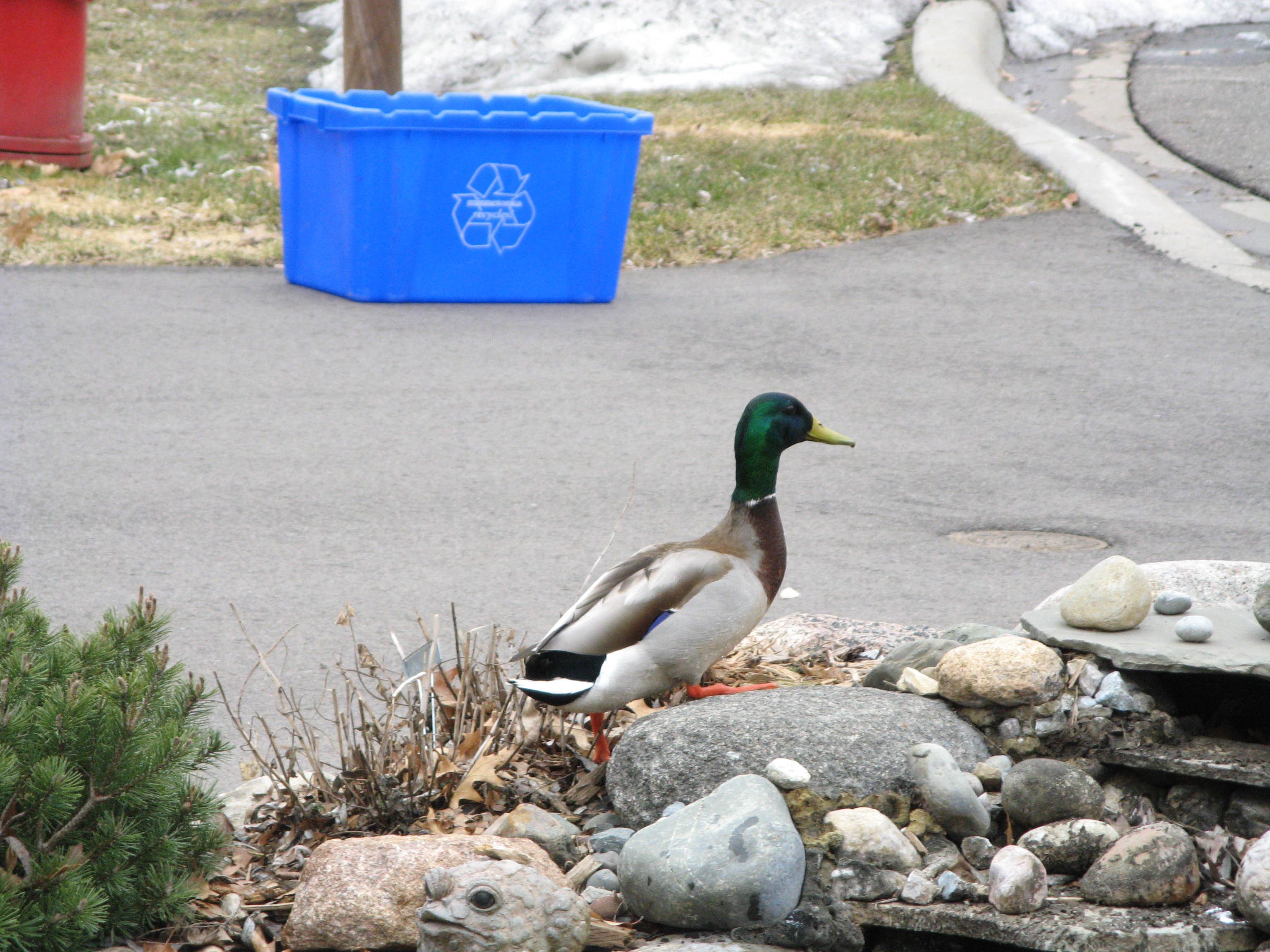 There are a pair of mallards that hang around. I like how this image captures just how 'regular' they are-- the recycling bin being in the shot is intentional.