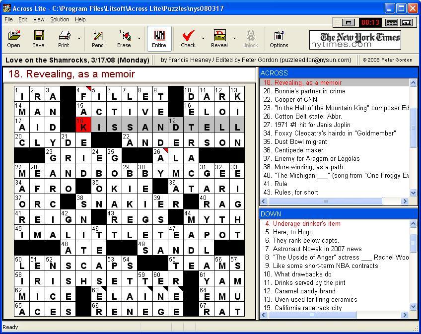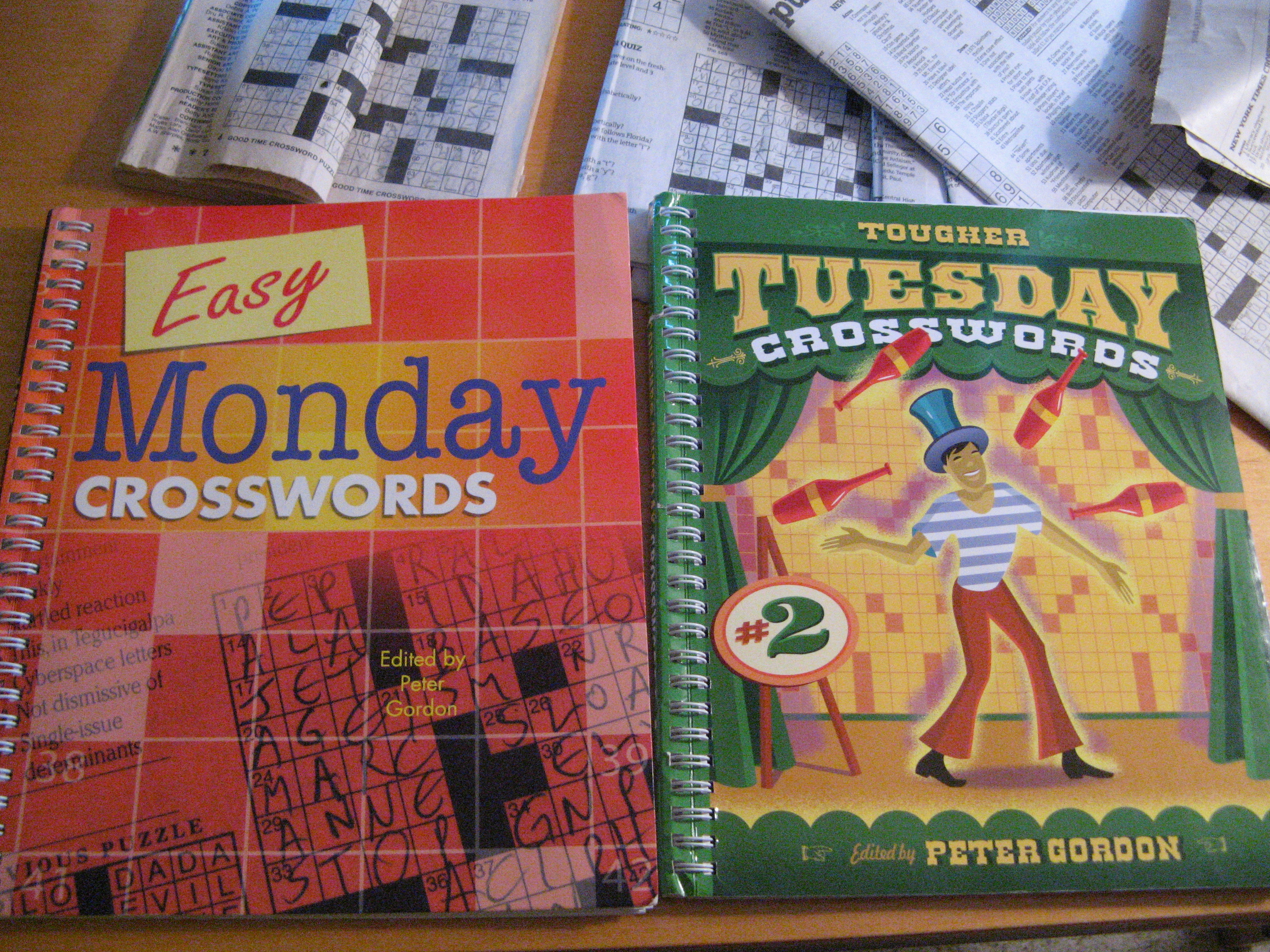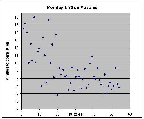 One thing I thought I would do to make this praxis a little more interesting is to log the times for some of the crosswords I did. Specifically, Monday NY Sun puzzles. For those of you who don't know, Peter Gordon is the editor of the NY Sun, and the puzzles he produces are on par with the New York Times. And for Monday, at least, they're pretty comparable in difficulty. So, no, these are not difficult crosswords. But there is still a skill to being able to complete them more quickly.