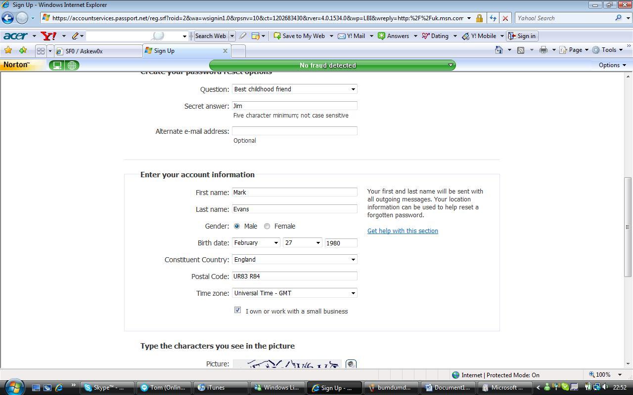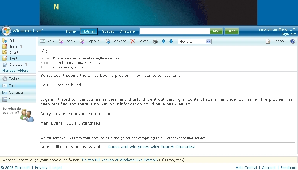 We created bddtenterprises@hotmail.com as our fake address, Storer may spot 'bddt' as 'buh-dum-dum-tsch' and discover us, but it's unlikely. And hey, we like to give him a fighting chance, I mean we know all that about him, and he knows nothing about BDDTEnt. does he?