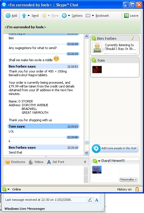 (21:13) storer: my brov is brill at compupers and will either sent a virouse or hack there systom, and iradicate us from there email list