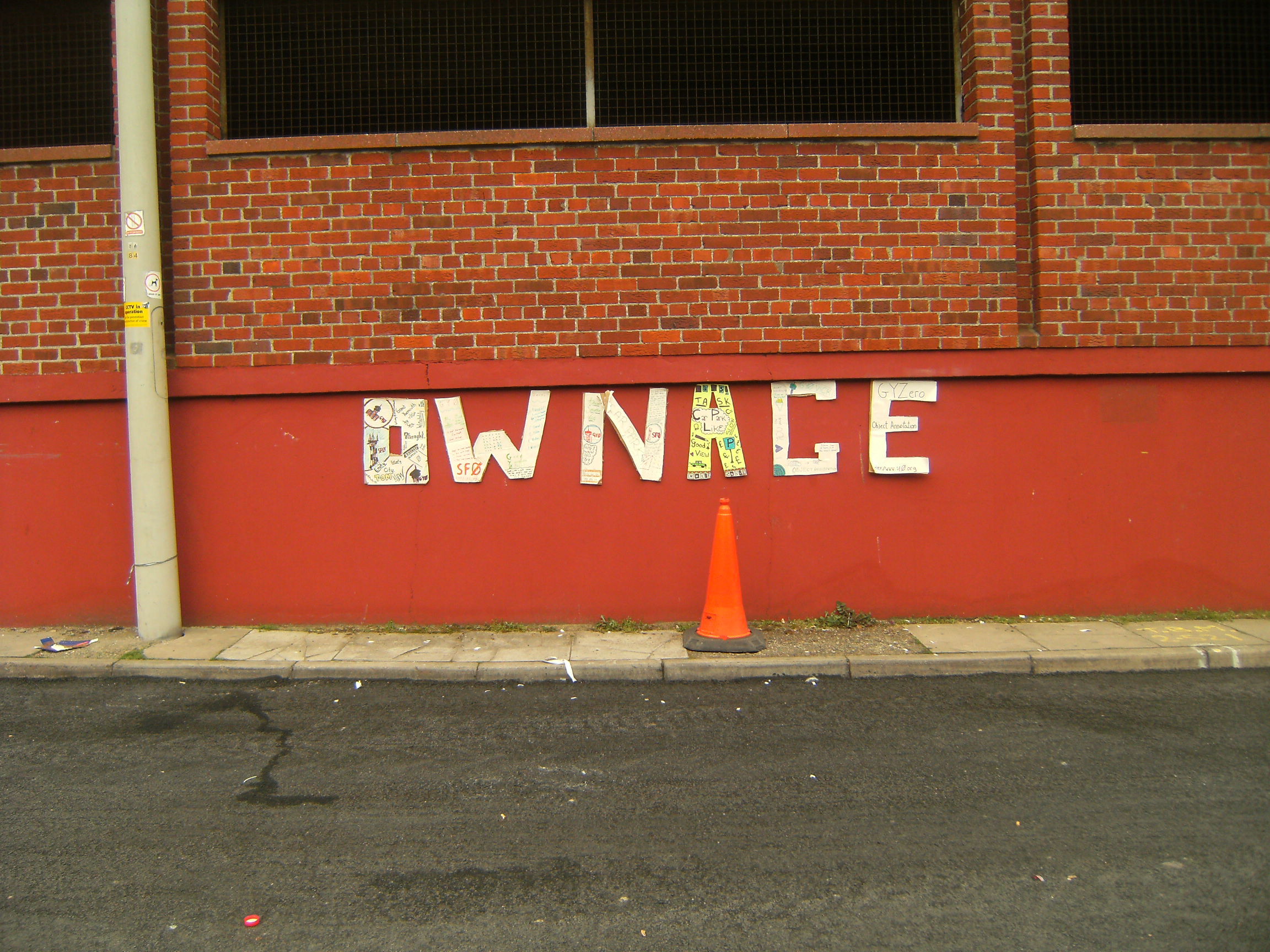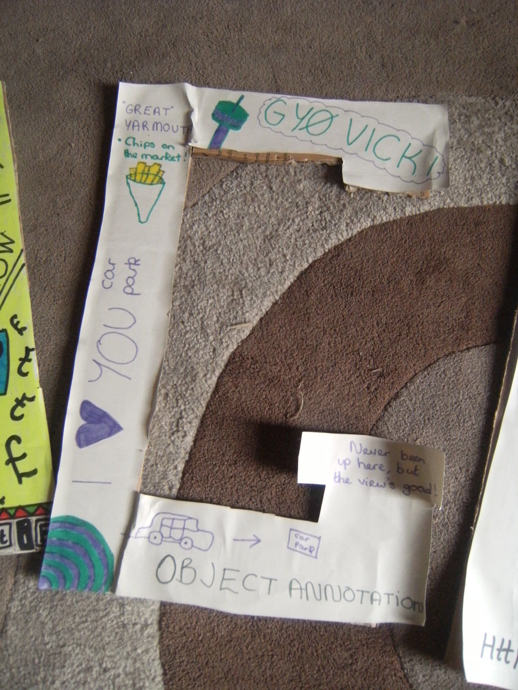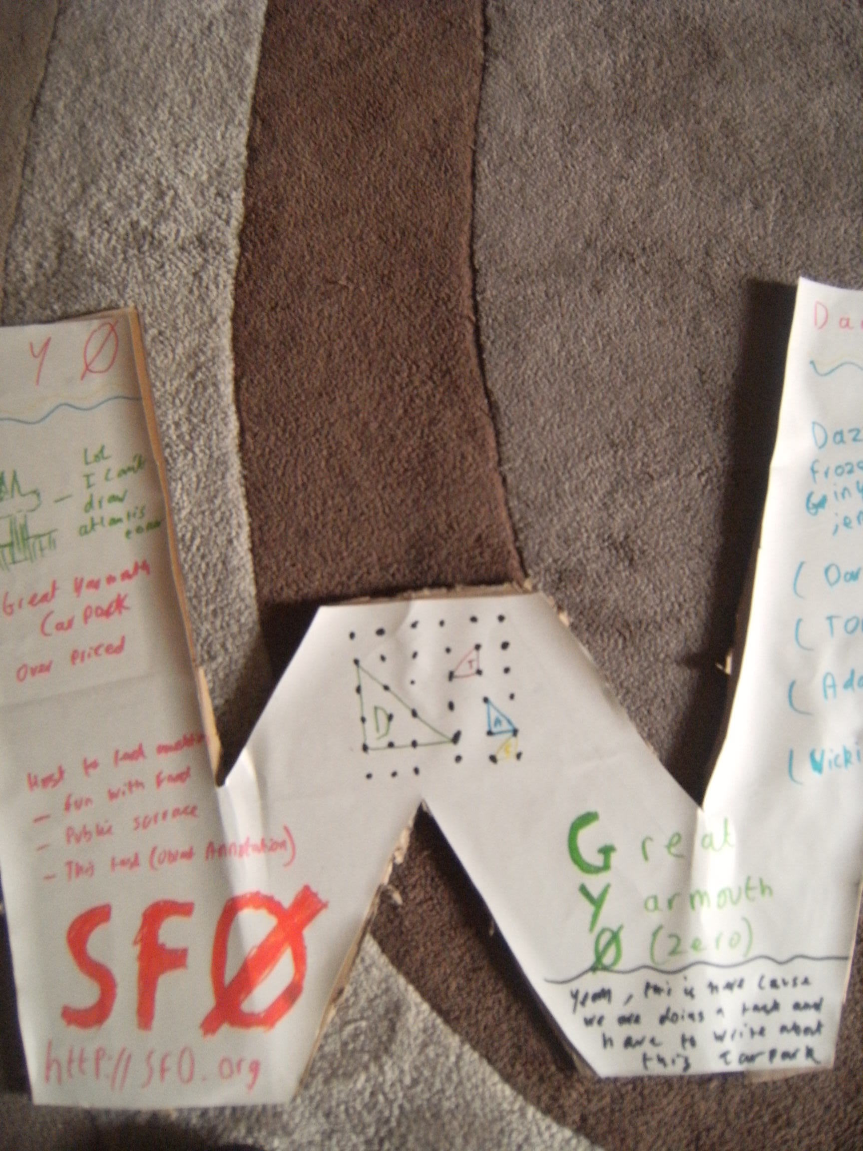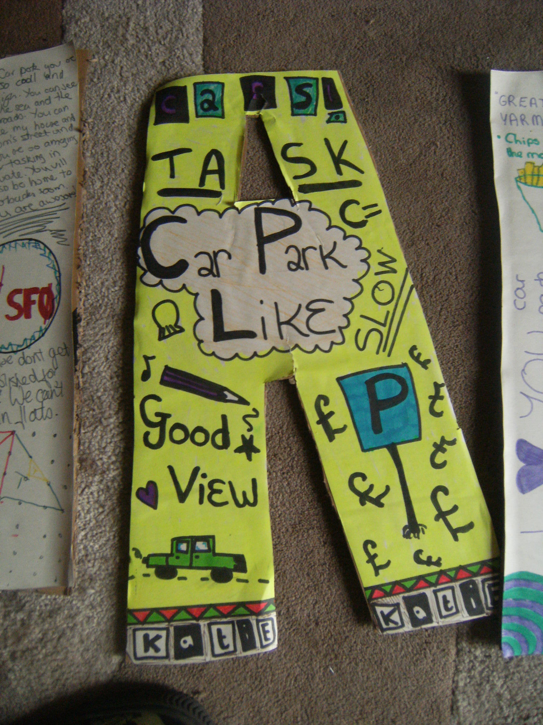 After putting the remnants of Remote Control Phoenix back into the skip, we adjourned to Tom's living room and set about doing our completion of "Object Annotation", but not just any completion a run of the mill completion! So, the night before, Tom got hold of an old computer box and created the word "OWNAGE", crudely stuck together with tape. Along with Adam's felt tip pens, we managed to do a letter each, describing our affections to the carpark at Market Gates and Great Yarmouth in general.