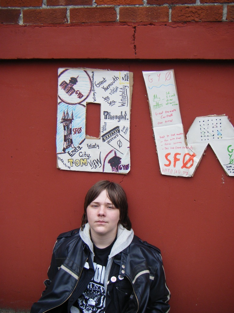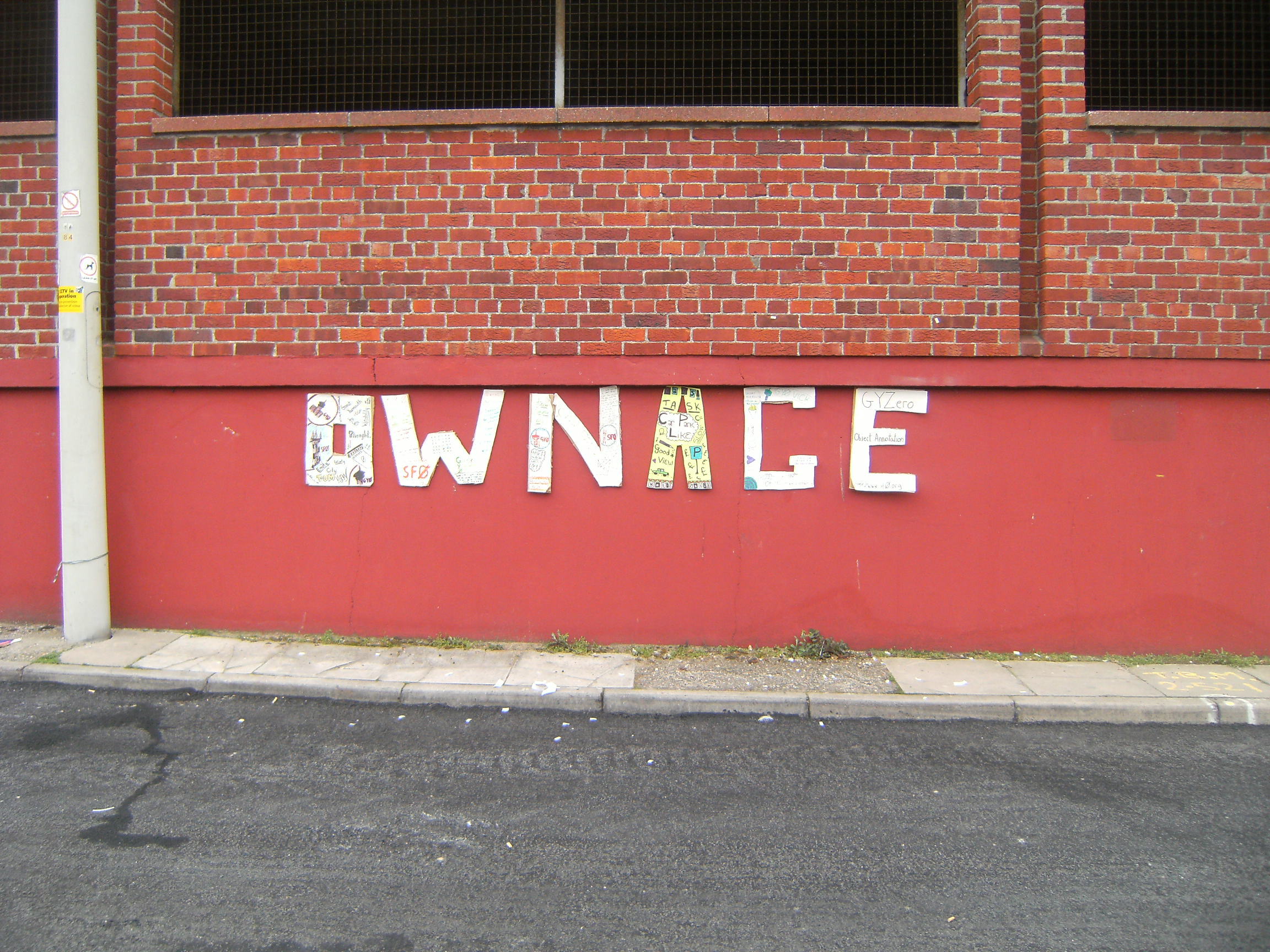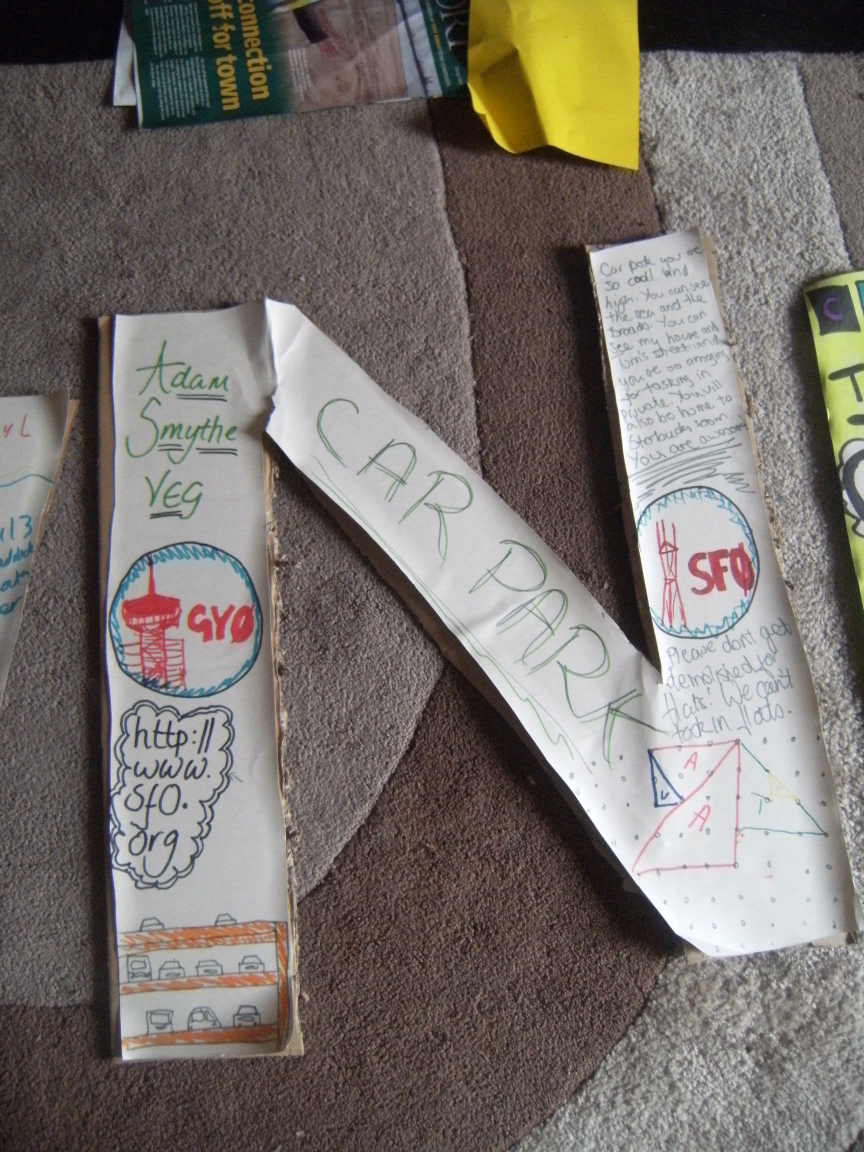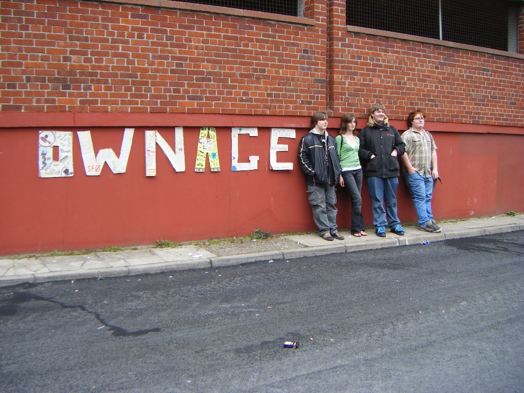 After putting the remnants of Remote Control Phoenix back into the skip, we adjourned to Tom's living room and set about doing our completion of "Object Annotation", but not just any completion a run of the mill completion! So, the night before, Tom got hold of an old computer box and created the word "OWNAGE", crudely stuck together with tape. Along with Adam's felt tip pens, we managed to do a letter each, describing our affections to the carpark at Market Gates and Great Yarmouth in general.