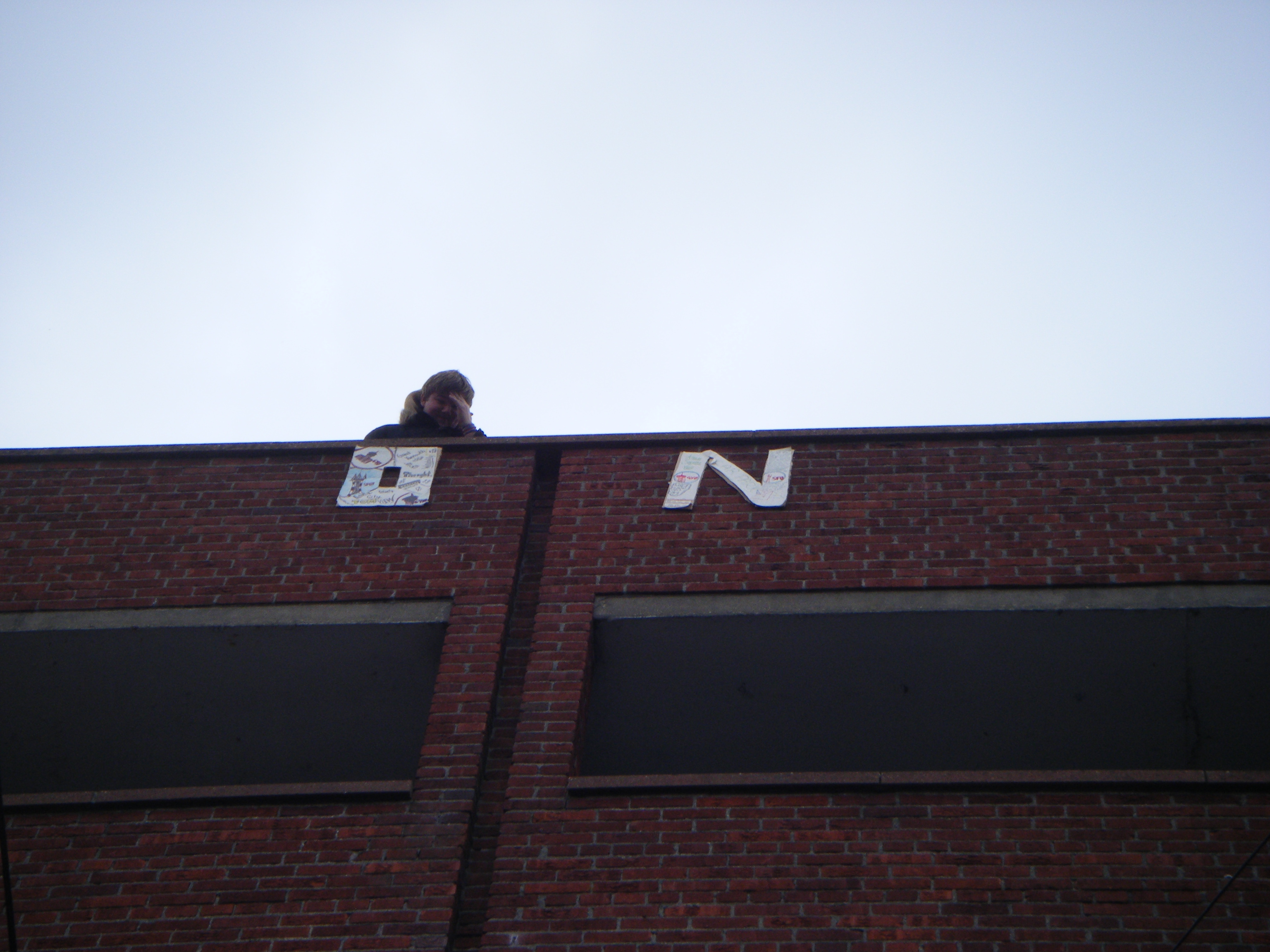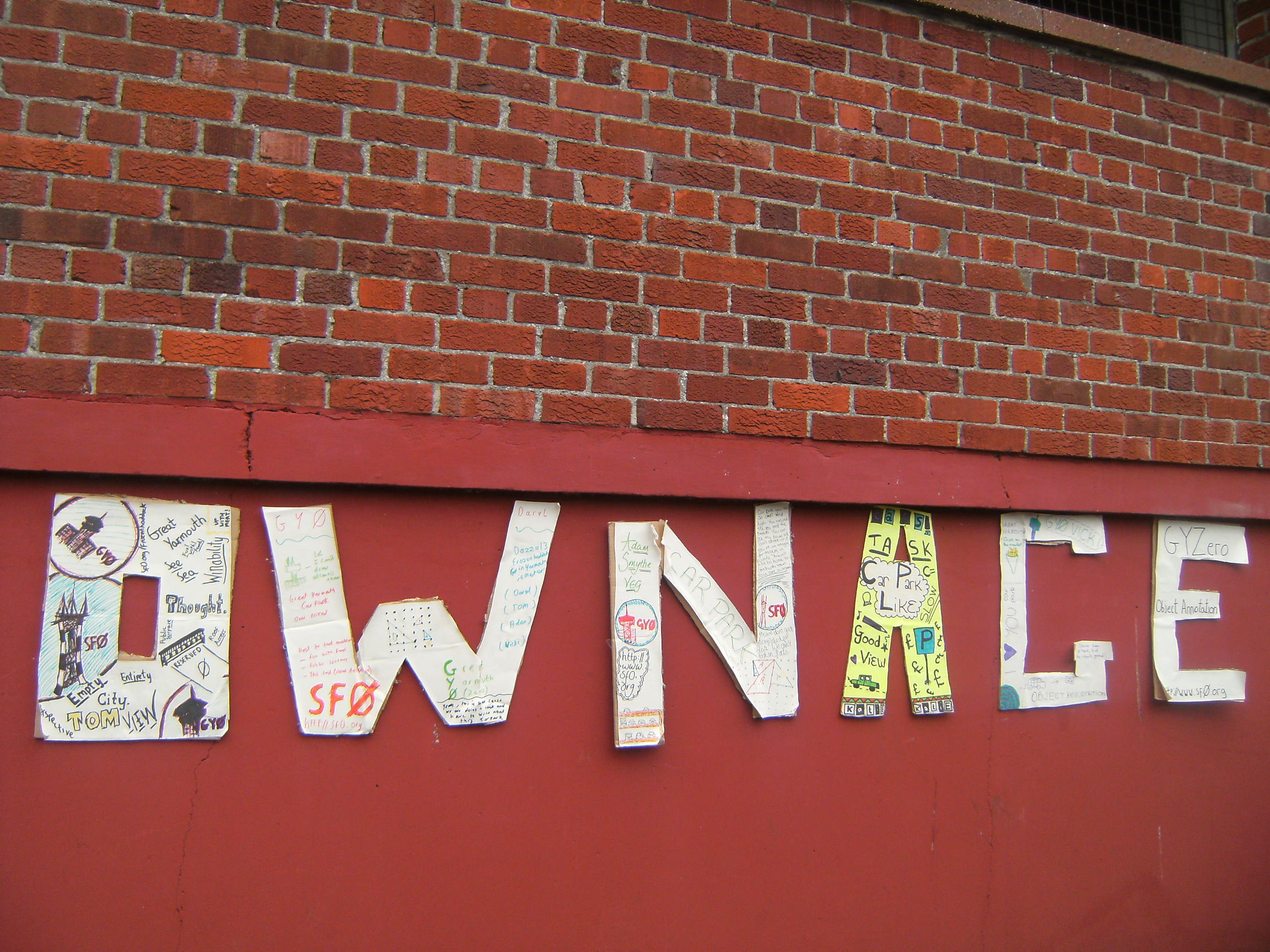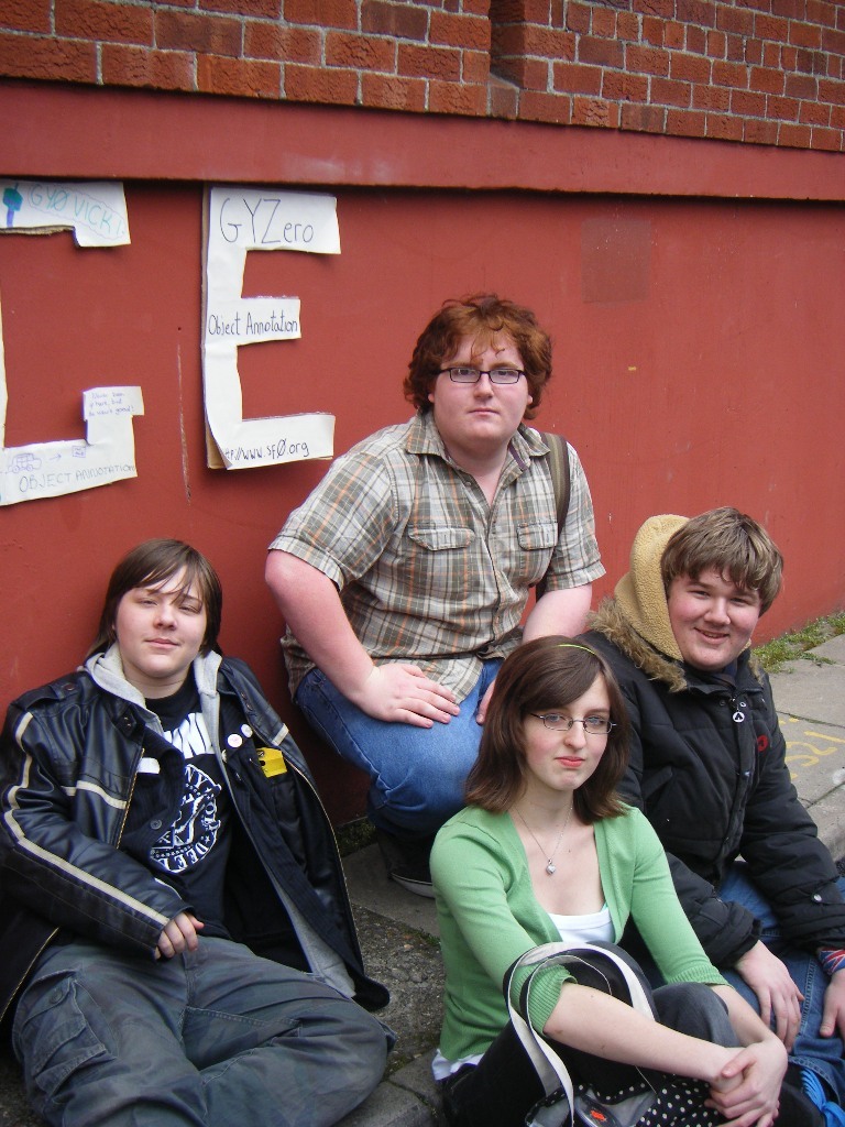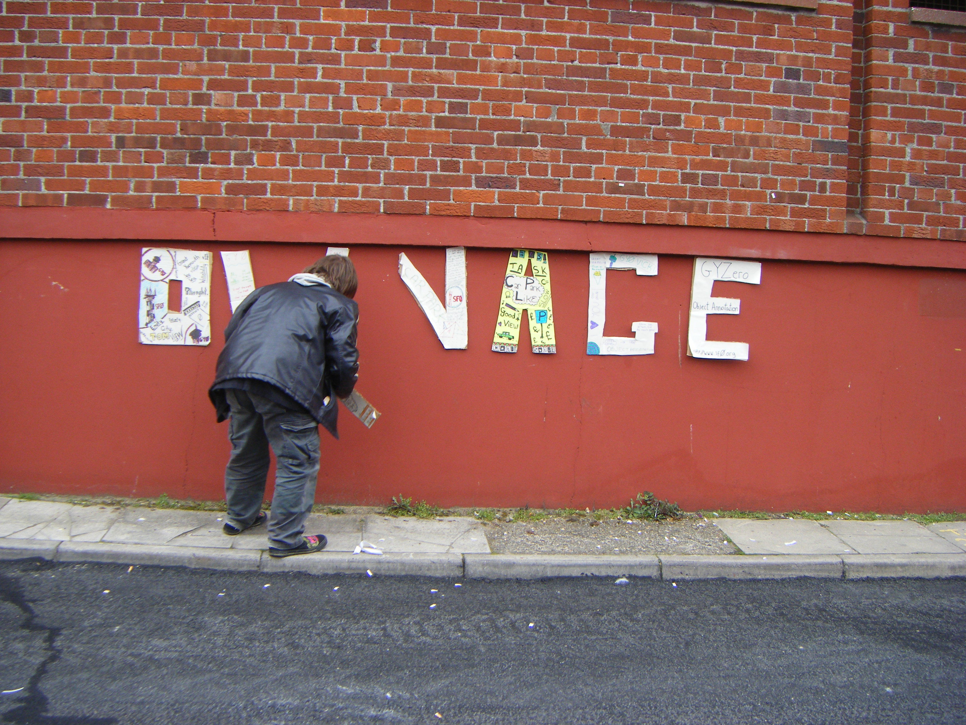 After putting the remnants of Remote Control Phoenix back into the skip, we adjourned to Tom's living room and set about doing our completion of "Object Annotation", but not just any completion a run of the mill completion! So, the night before, Tom got hold of an old computer box and created the word "OWNAGE", crudely stuck together with tape. Along with Adam's felt tip pens, we managed to do a letter each, describing our affections to the carpark at Market Gates and Great Yarmouth in general.